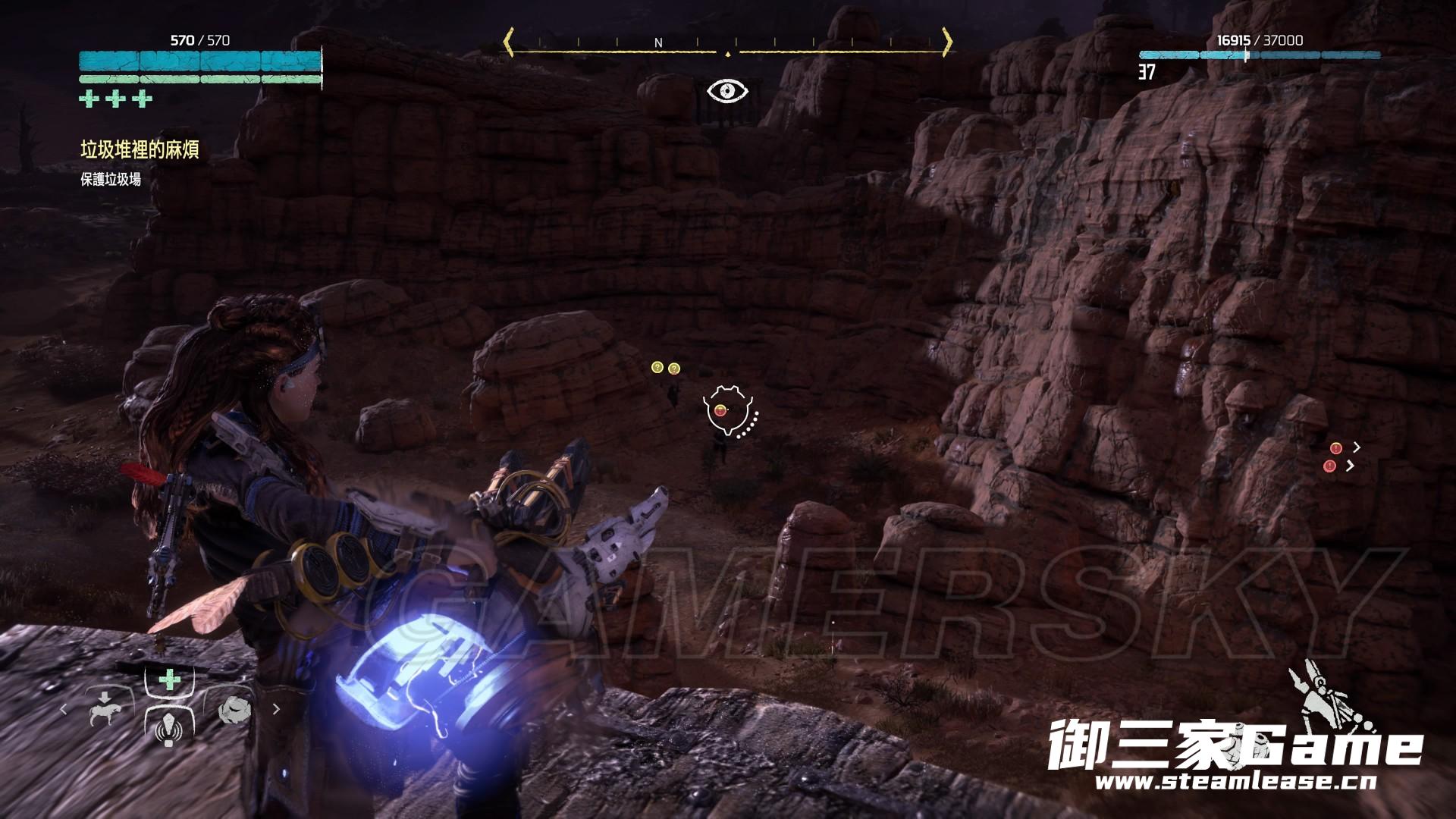 亚萝伊当然不会介意帮佩脱拉一个小忙,前往土匪营地,途中山谷零星几个守卫的土匪,一一射杀,走右侧高台过去土匪营。