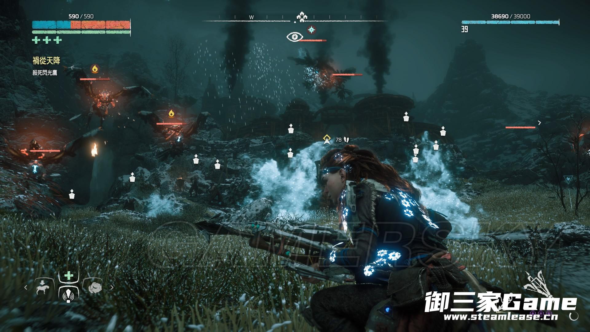 注意山顶雪原上的沟壑,击杀长腿兽后过来另一片雪原,一只急冻风背兽以及远处几只守视者,下去击杀。