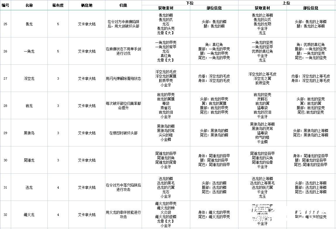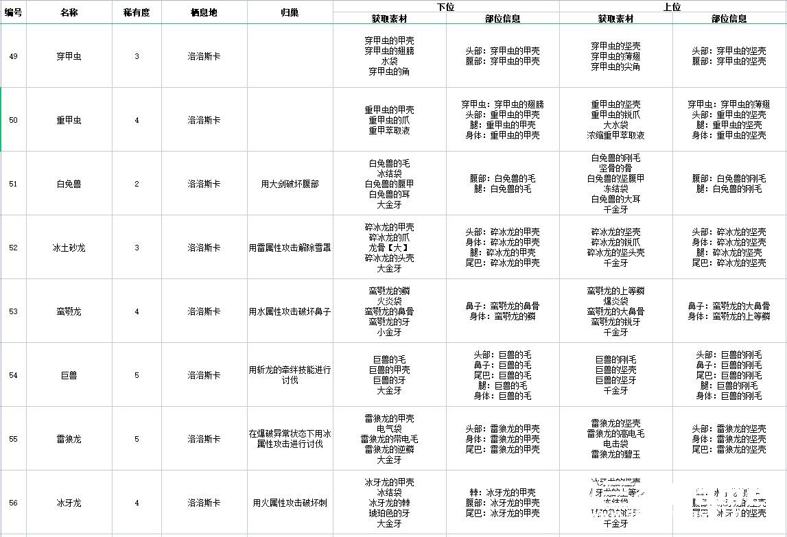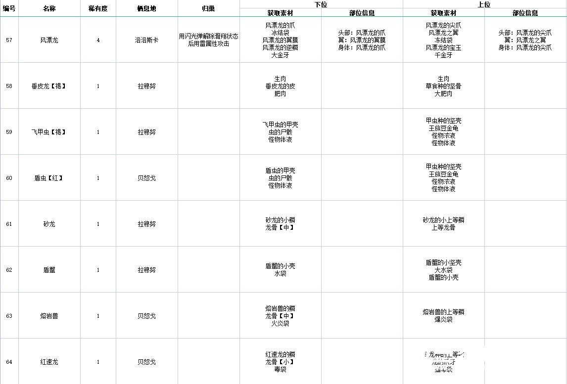 部分内容存在“bug”,例如:冰土砂龙的材料都是碎冰龙XX,以及部分翻译为刺,部分为棘等等,均是官方翻译的锅,下图表中的所有文字和数据都是照搬的游戏内怪物图鉴