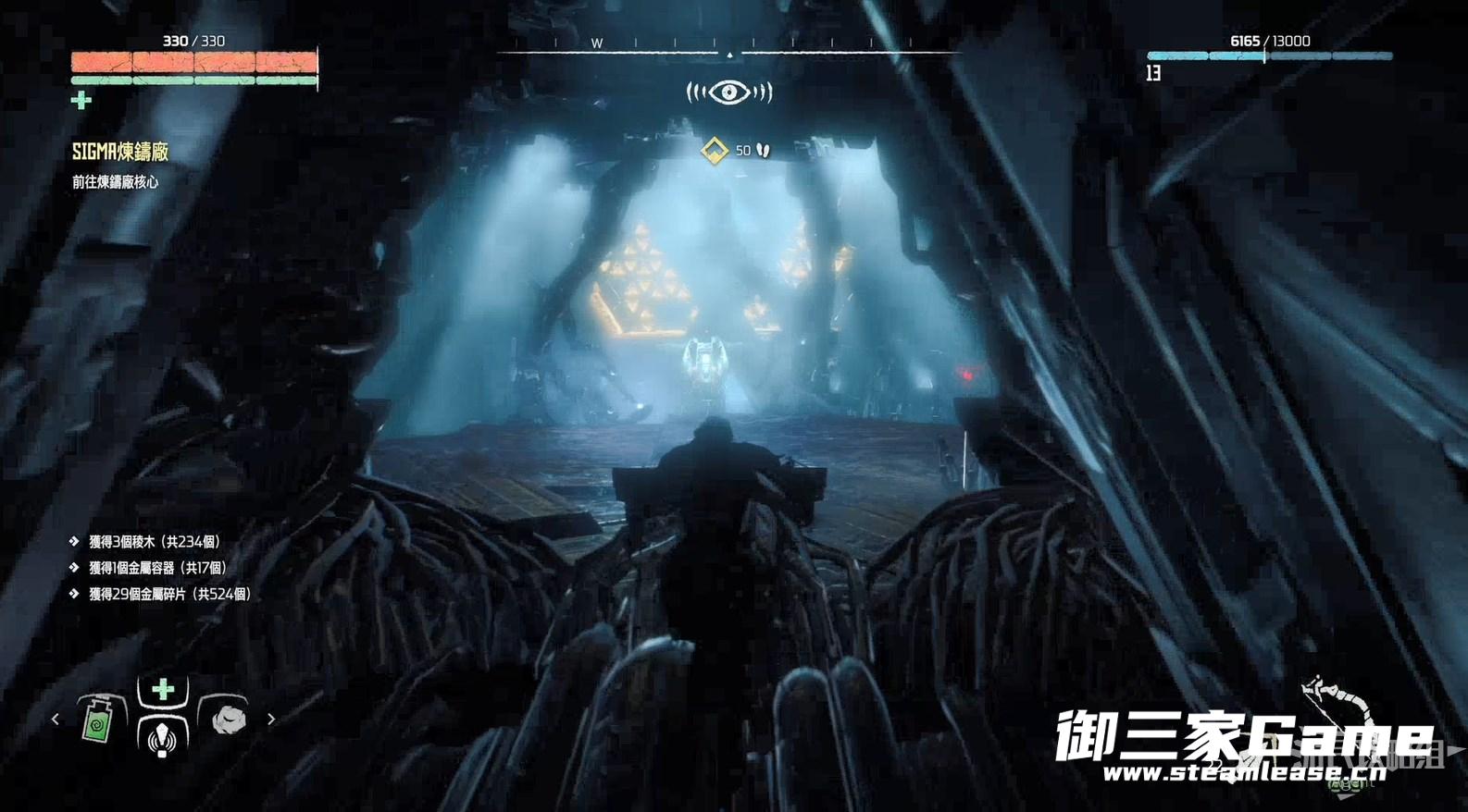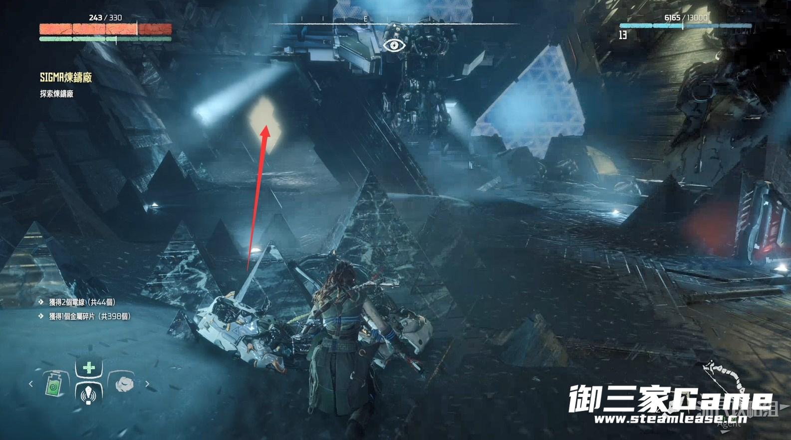 然后会遇到不少敌人,尽量不要被发现,往前走与冒红光的设备互动,接通桥梁。