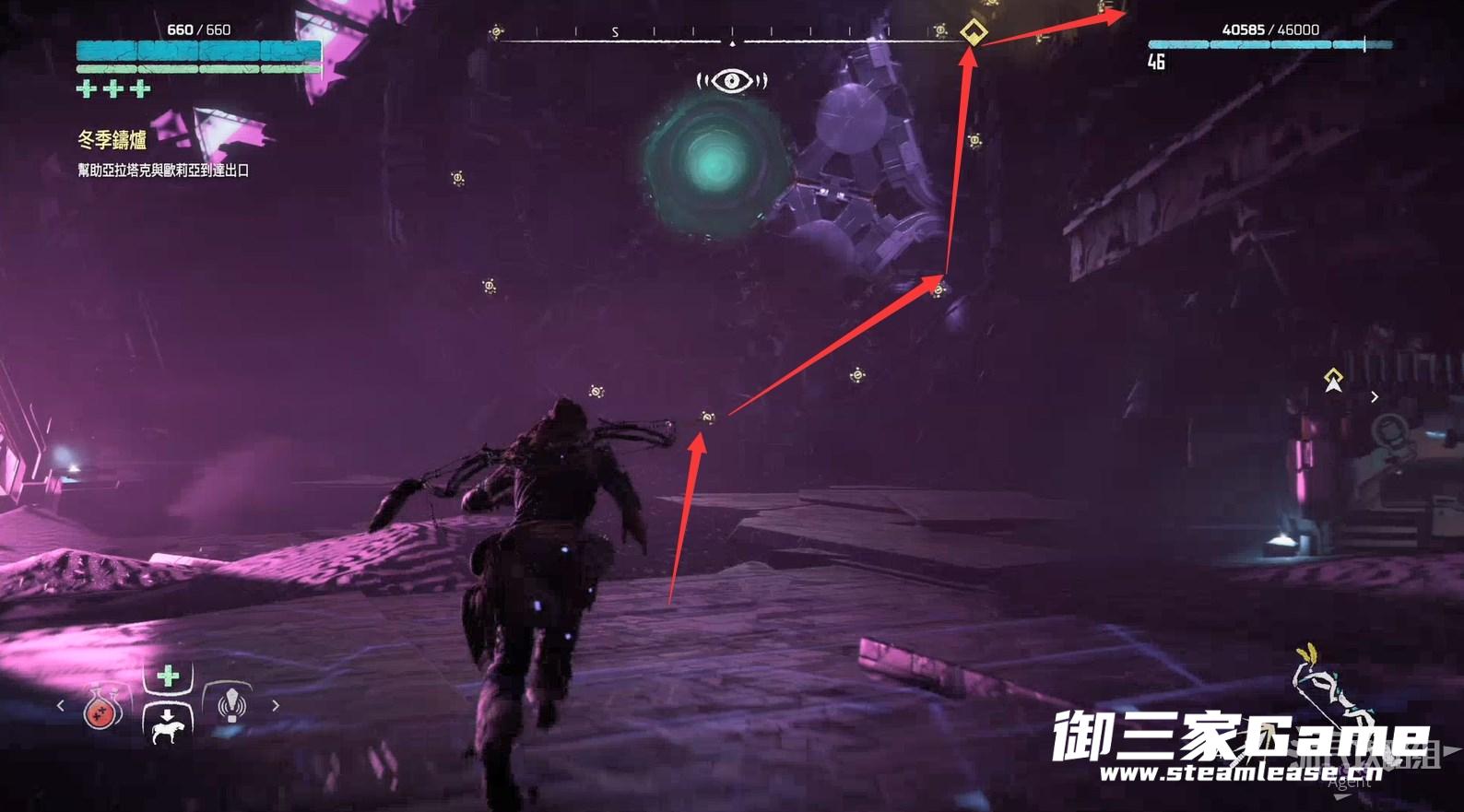用弓箭射掉紫色的团簇,然后就可以攀爬通过了。