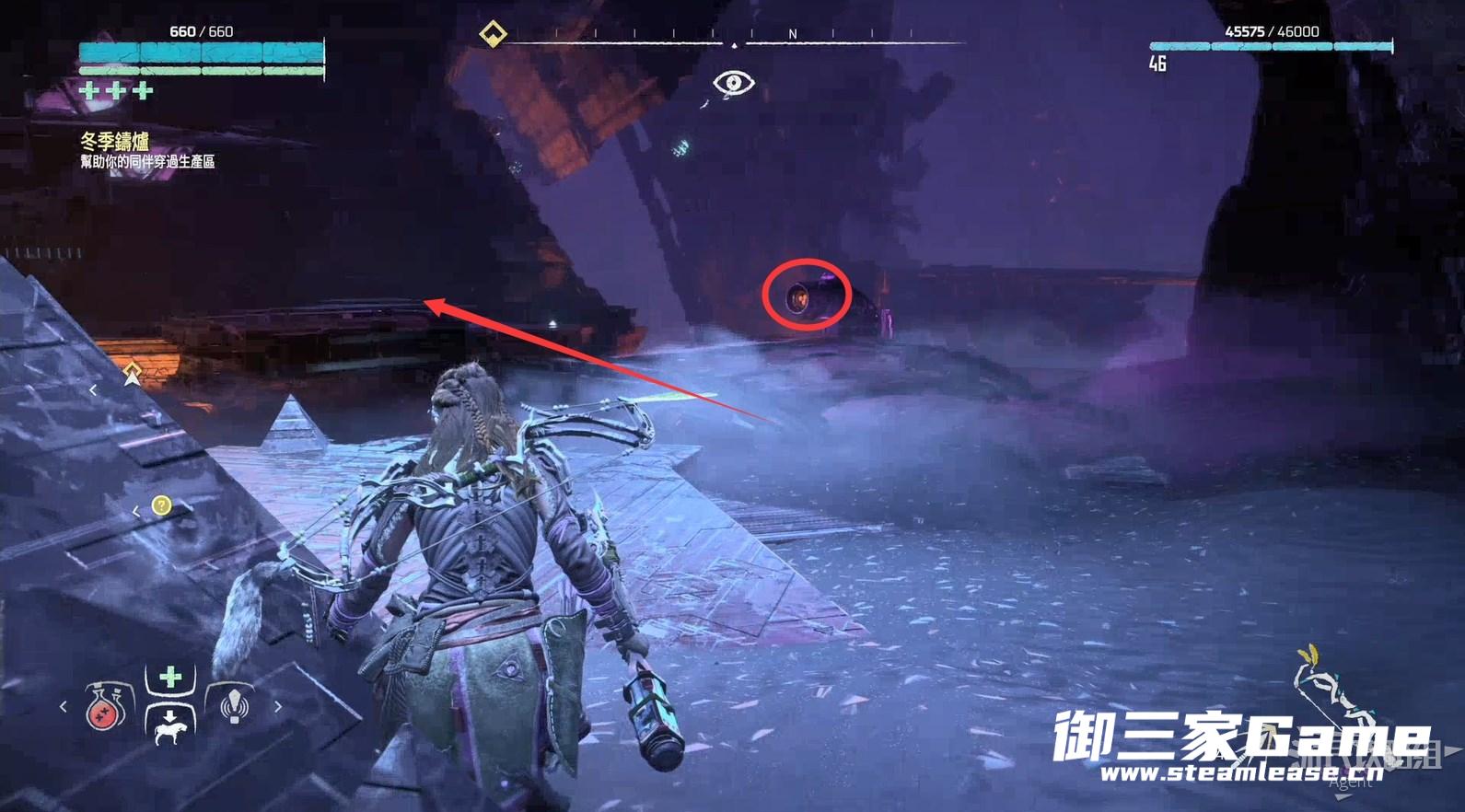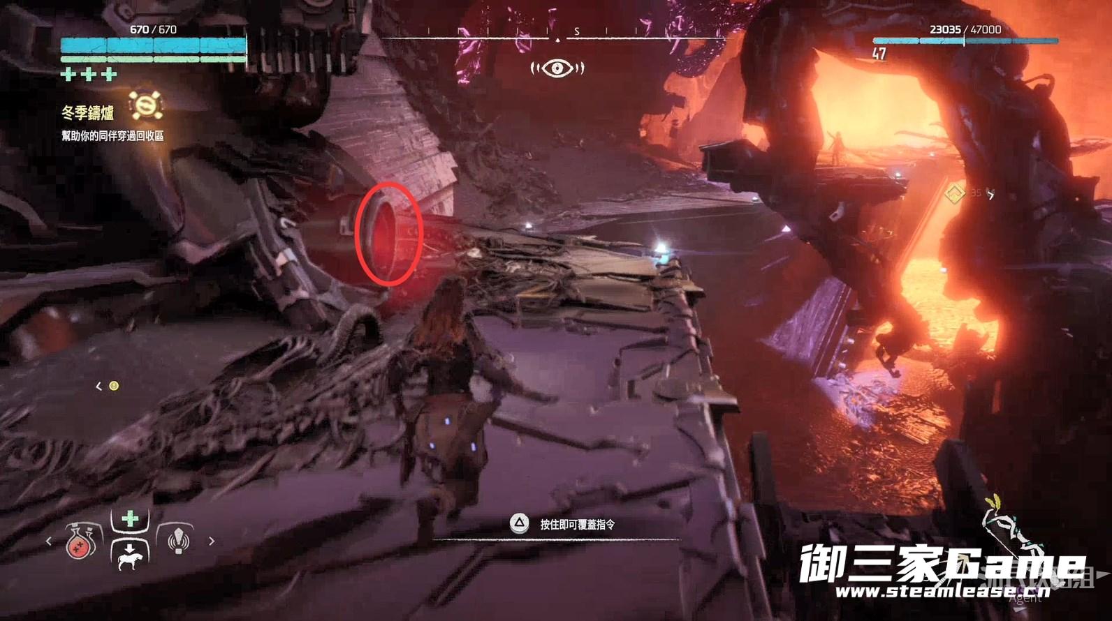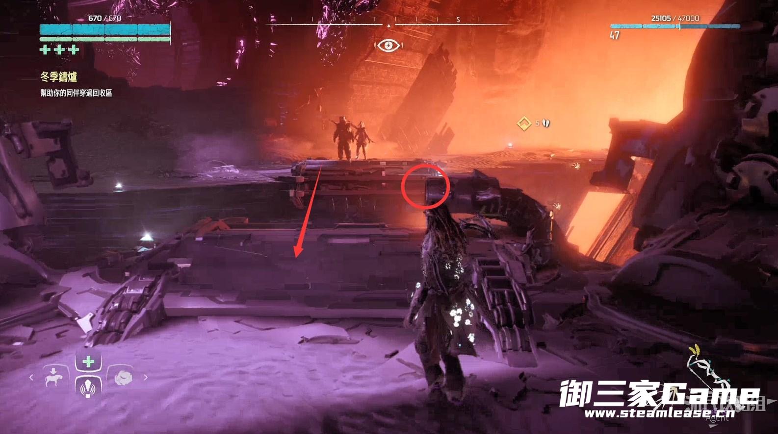 往下走操作控制台开门,来到回收区。到左边的长颈兽遗骸,从这里垂降下去。