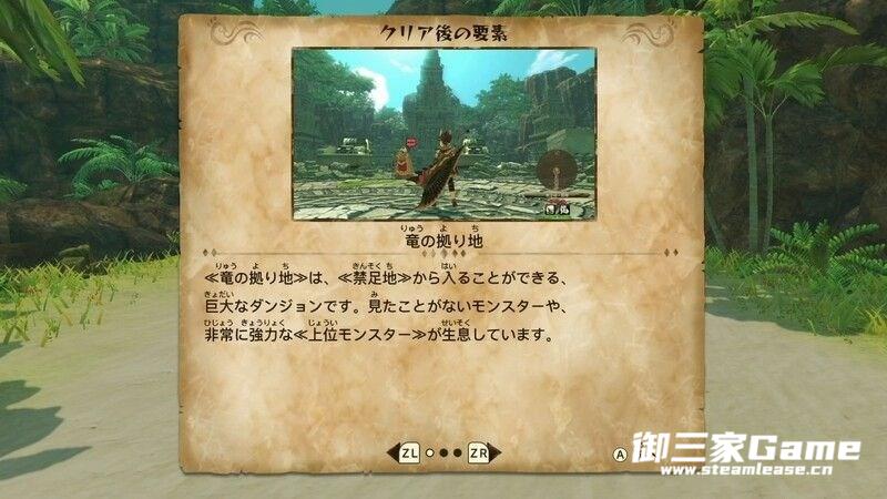 读取通关存档后会被指引到夏口洛禁地深处的地牢【古地龙巢】——多层迷宫,以挑战难度更高的任务和怪物,同时获得大量经验值和特殊随行兽。