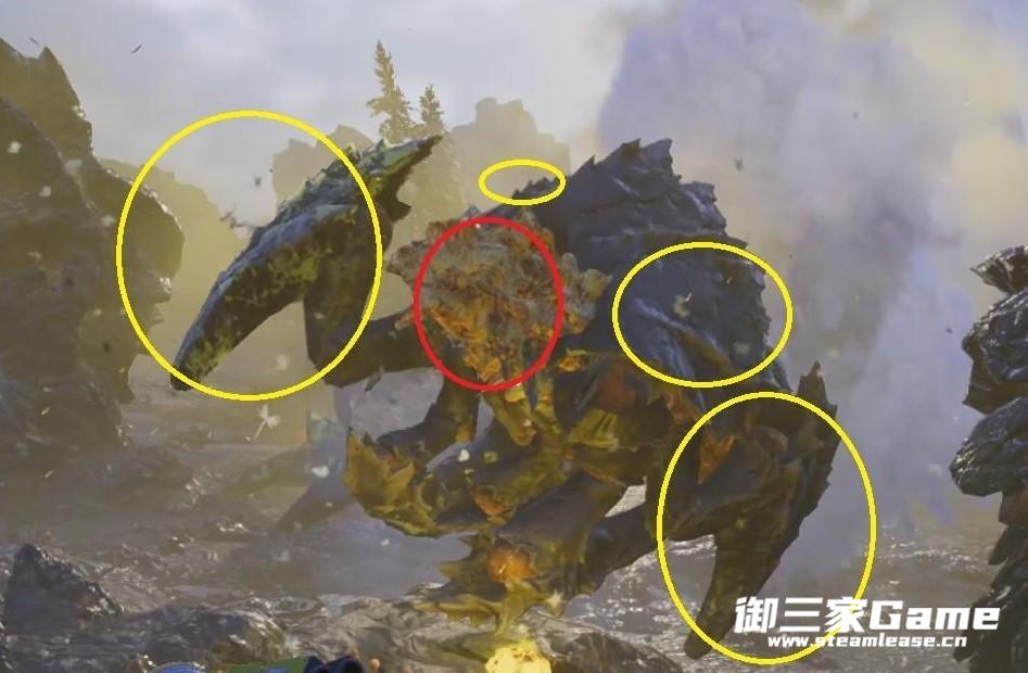 换句话说,如果你有信心用两发火箭轰头秒杀就直接打头,但如果没信心的话就瞄准黄圈处帮他脱壳,这样队友可以用普通子弹打露出的肉质部位提供输出。