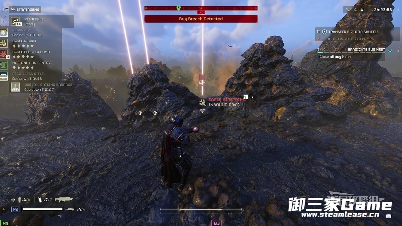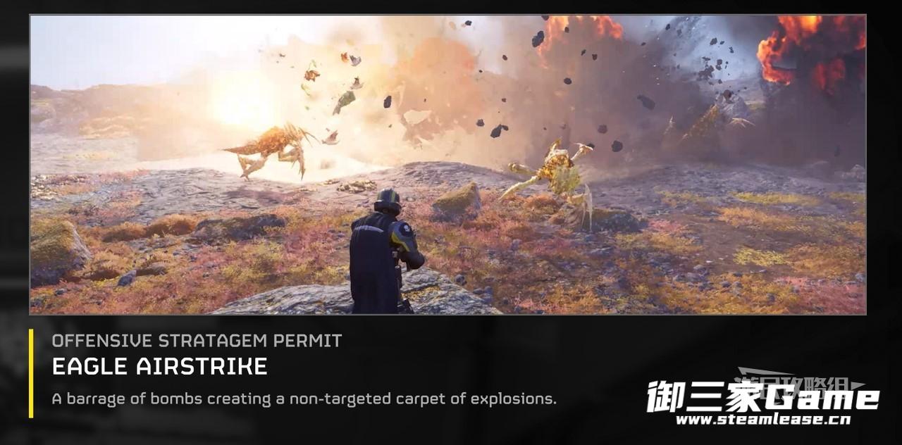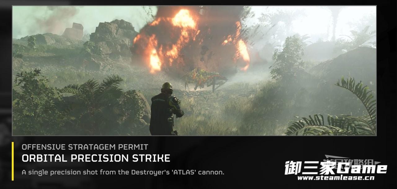 这是开局解锁的战略配备,建议大多数任务期间都要携带,直到达到5级。适用于清除虫洞,以及前期能遇到的一些难缠的敌人(例如冲锋虫),也能提供一定的帮助。体型较大的敌人可以用炸弹来解决,或者将轨道精准攻击与消耗性反坦克武器搭配使用。除此之外,轨道精准攻击的冷却时间为100秒,因此在任意时长的行动期间基本都可以多次使用。