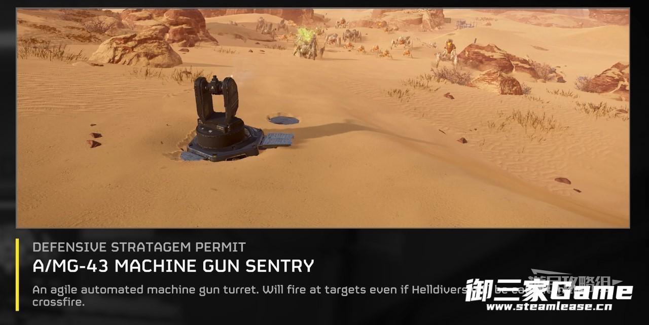 无论是单人还是多人合作,A/MG-43哨戒机枪都是非常便捷的战略配备之一,尤其是前期需要快速升级时。A/MG-43哨戒机枪在2级时即可解锁,短短3秒钟内即可拥有一个能够迅速移动并高速开火的炮台,来应对各个星球上密集的虫群或机器人。当有多个敌人同时接近时,建议使用A/MG-43哨戒机枪来帮助完成火力压制,在单人游戏中可以防止被包围,多人游戏中可以增加火力。