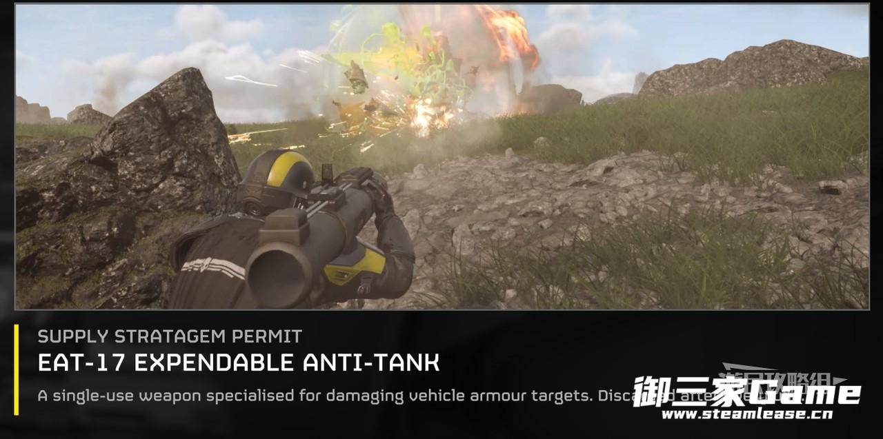 可以在3级时解锁,执行中等及以上难度的行动时建议携带,在此难度的行动中有概率会遇到冲锋虫,消耗性反坦克武器主要用来应对此类敌人。消耗性反坦克武器只能使用一次,用完即扔。每当玩家自己或队友使用此战略配备时,能够得到两把,所以可以同时使用打出两发伤害,或者与队友共享。