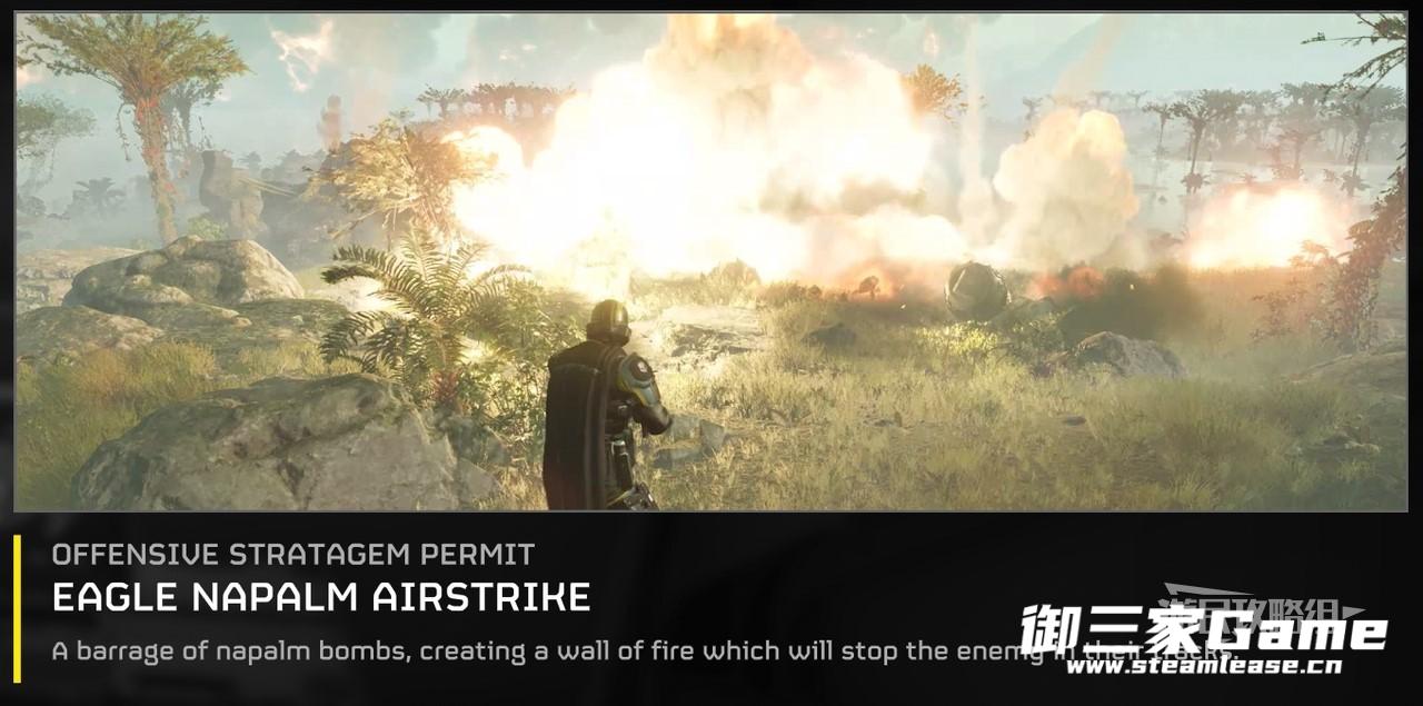 “飞鹰”凝固汽油弹空袭能够造成大量伤害并持续摧毁目标,可以清除整个虫巢,还能牵制敌人行动。5级时即可解锁,使用次数为2次,但冷却时间只有15 秒。不过适用的场景比较少,建议按需考虑解锁。