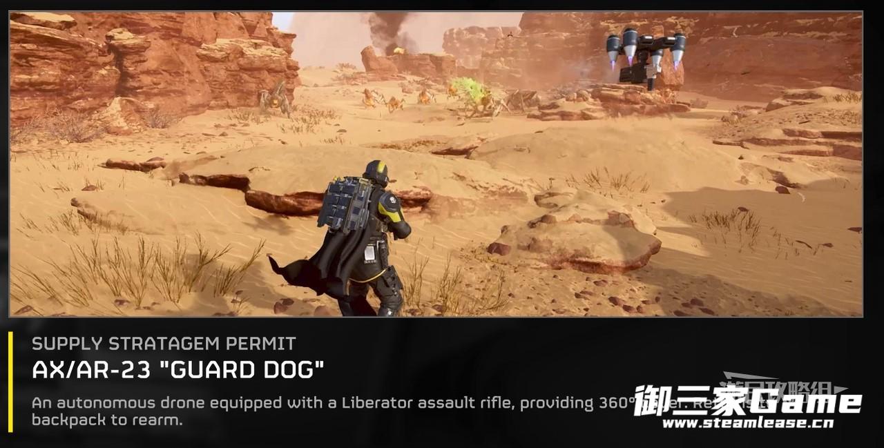 “护卫犬”和“护卫犬”漫游车就像是私人保镖,可以将身后安心交给它,“护卫犬”使用“解放者”突击步枪,“护卫犬”漫游车使用激光步枪,具体的选用可以根据个人喜好或具体环境来决定。这两种武器都能提供360°的范围覆盖,阻止敌人靠近,其中需要注意的是“护卫犬”的突击步枪消耗弹药,“护卫犬”漫游车的激光步枪是过热冷却,在体感方面突击步枪的弹药消耗比较快,而激光步枪的过热冷却期比较短,能够持续射击的时间比较长。