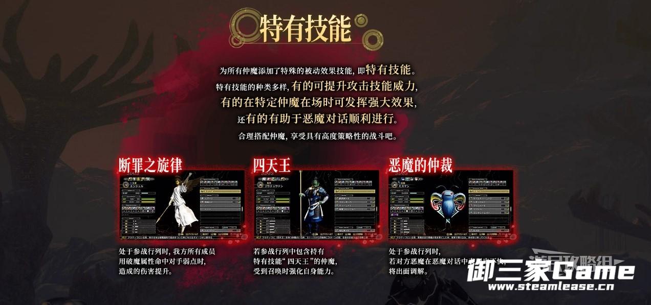 此外,《真女神转生5复仇》还为所有仲魔添加了特殊的被动效果技能,本作称之为【特有技能】。特有技能的种类多样,有的可以提升攻击技能威力,有的在特定仲魔在场时可发挥强大的效果,还有的有助于恶魔对话顺利进行。