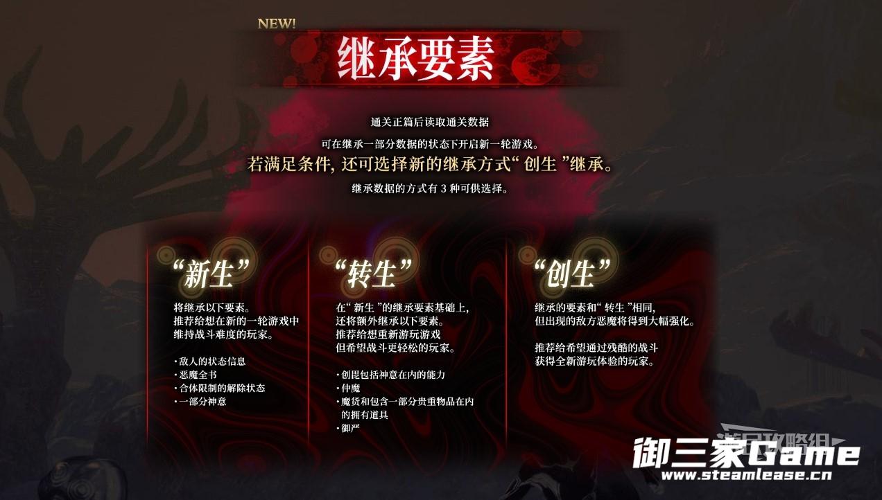 继承要素中增添了新的继承方式【创生】。在通关正篇后读取通关数据可在继承一部分数据的状态下开启新一轮游戏,新增的【创生】继承要素与【转生相同】,但出现的敌方恶魔将得到大幅强化。商店里还会出售相关辅助道具。推荐给希望通过残酷的战斗获得全新游玩体验的玩家。