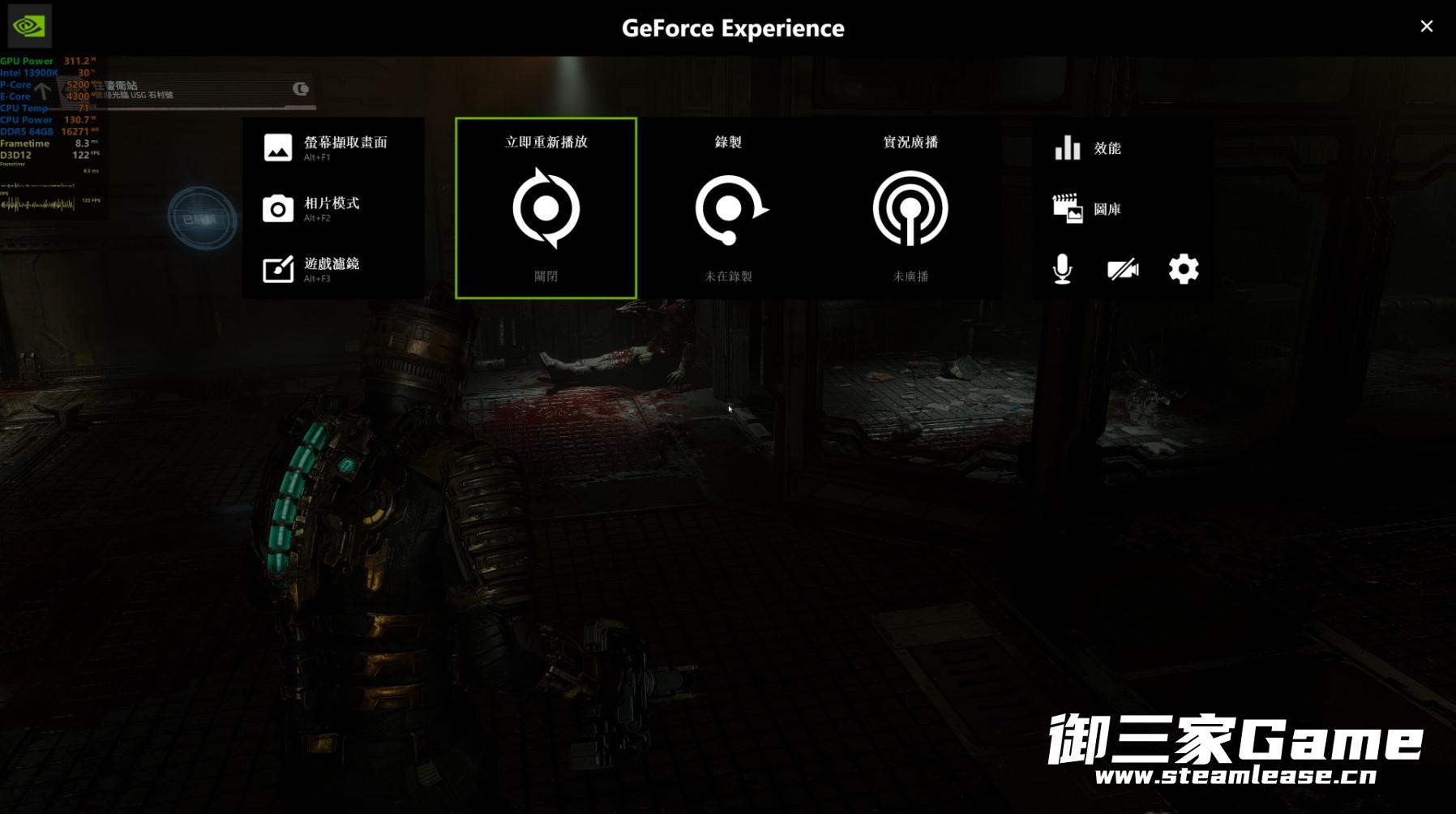 先去下载geforce experience,然后进游戏按alt+z 呼出界面