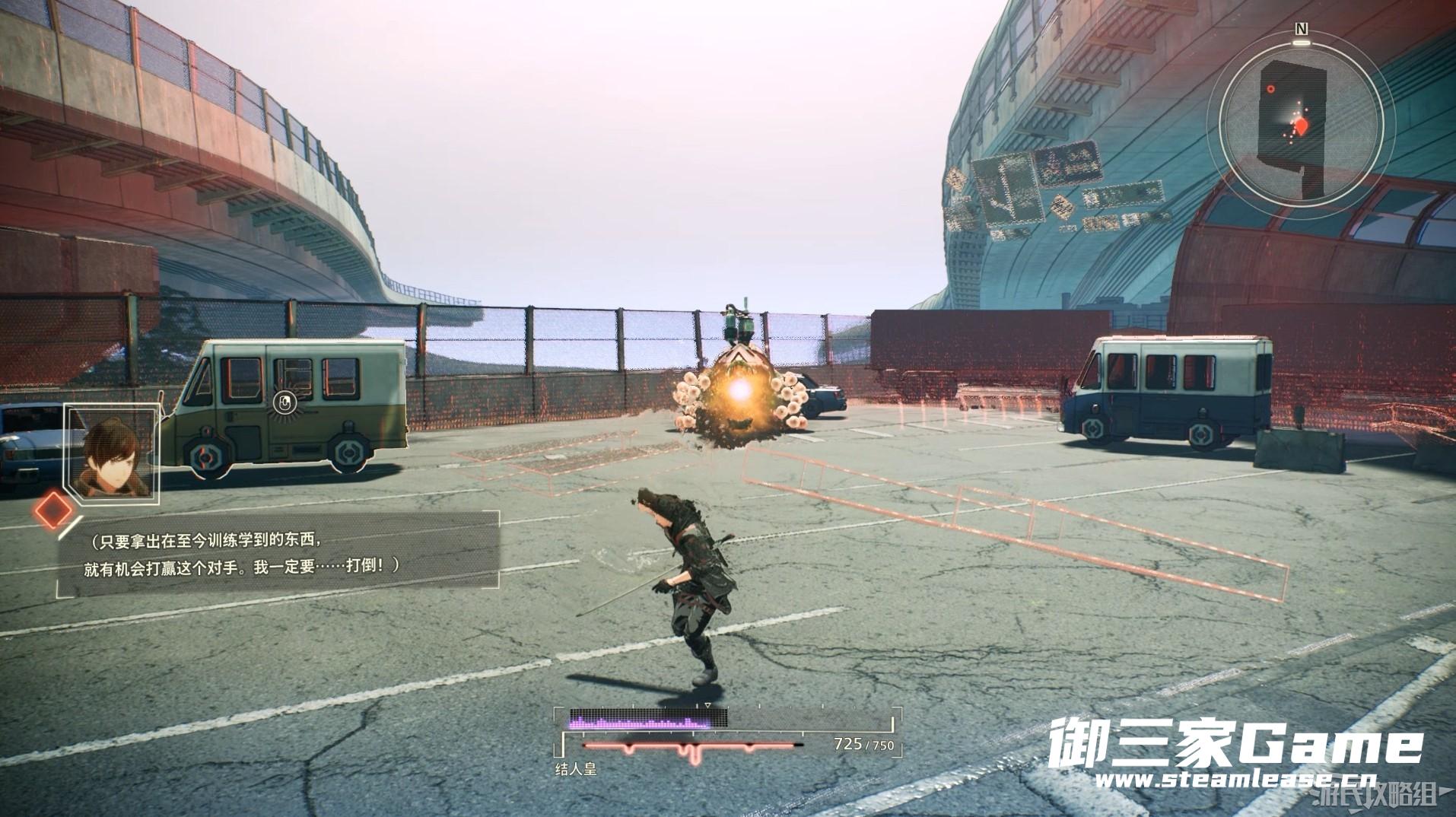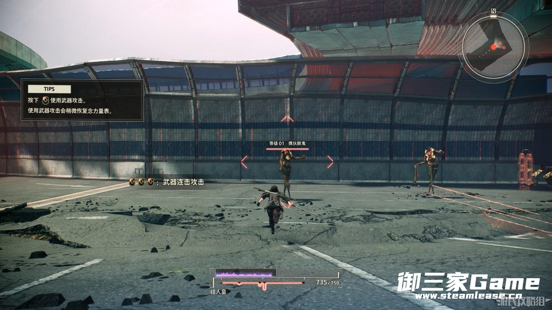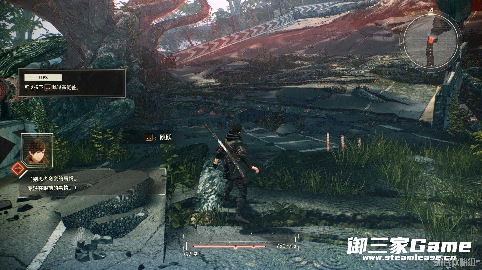 进入训练后,在界面正中间的人物则为我们的主角结人皇,正中间下方的红色电波图代表玩家角色当前的生命值,在被怪异攻击后会损失生命值,当生命值为零角色会死亡并从最近的存档点重新开始挑战。界面右上角为小地图,我们可以通过小地图查看附近的道路和任务目标大致的方位。