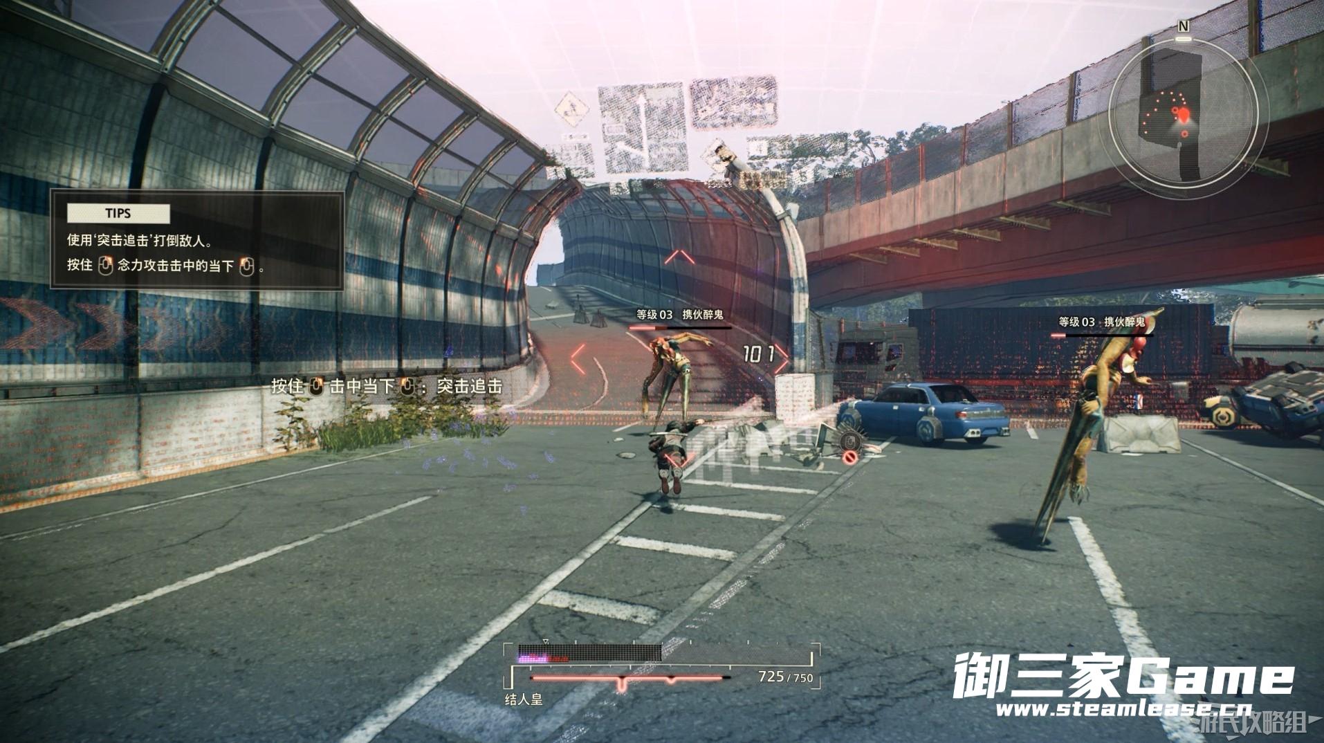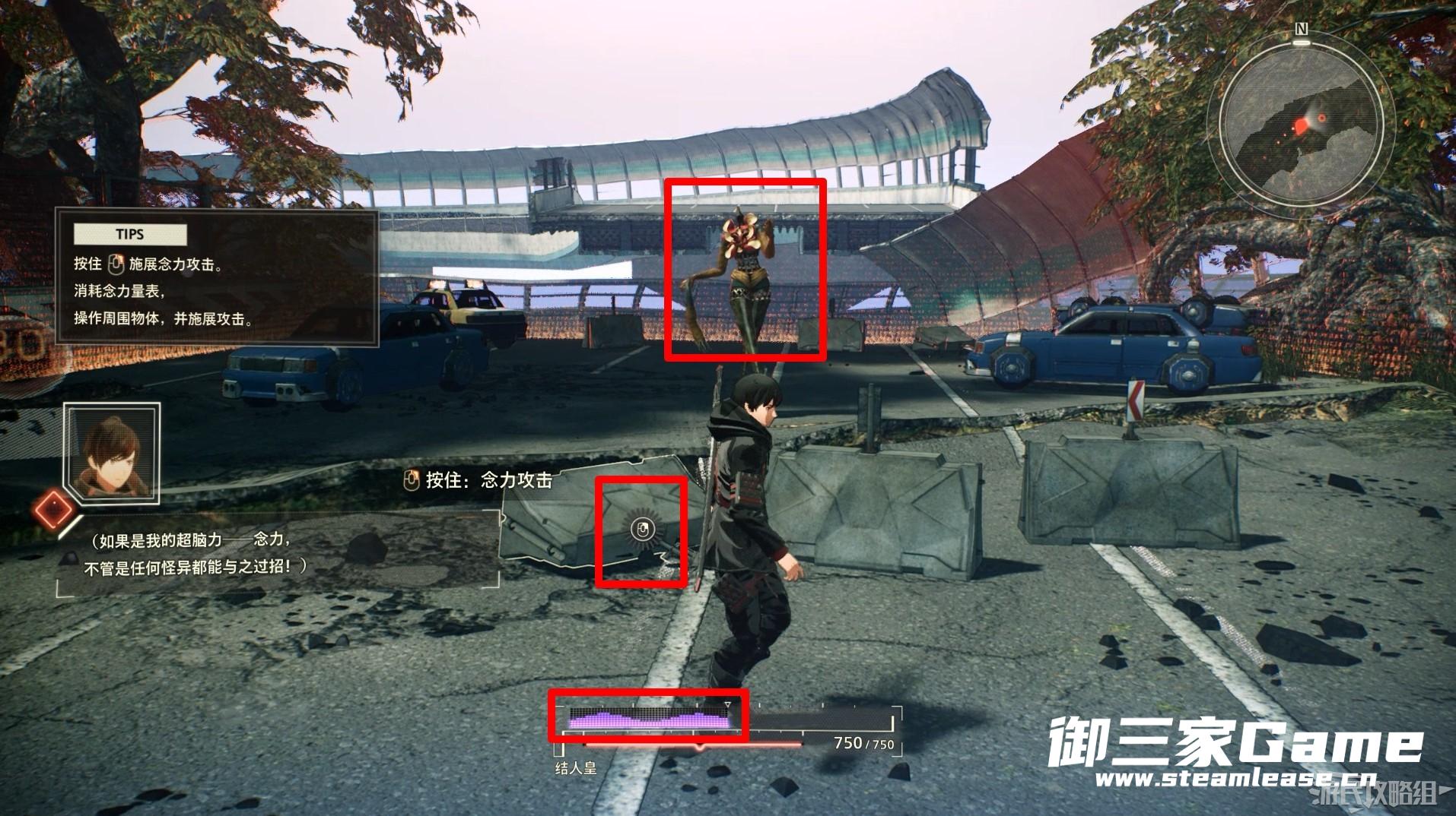 在道路前方我们首次遭遇怪异,结人皇的超脑力为使用念力,我们可以通过长按鼠标右键是用念力控制周围的物体攻击怪异。