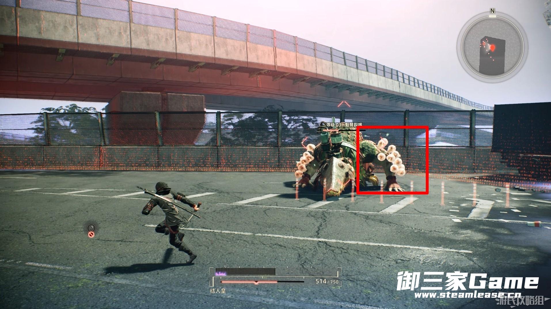 在训练阶段的最后我们需要击败一只魁臂裂嘴,除使用嘴进行撕咬等近战攻击外,该敌人还会从嘴中向前发射冲击波进行攻击,躲避该怪异正面即可。