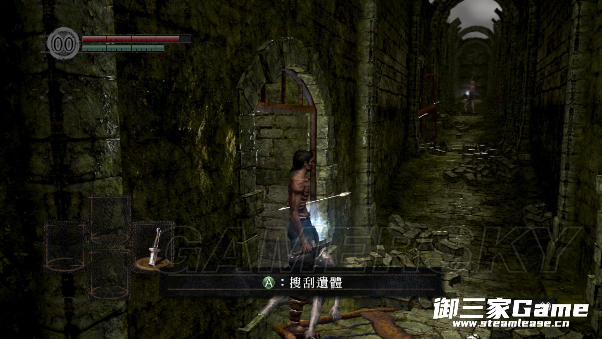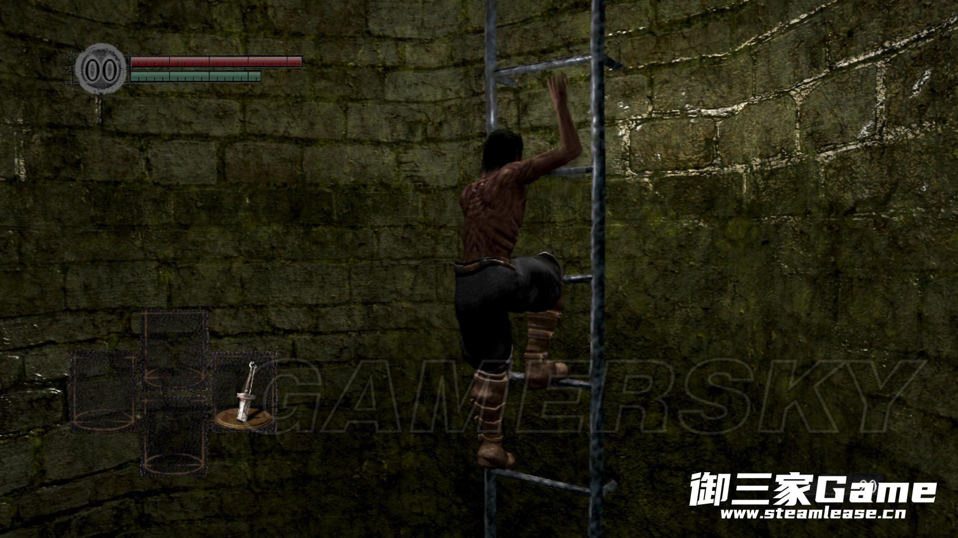 沿地牢的通道前进,通道边上的活尸不用管,地上的建言会提示一些基本操作,沿通道来到水井处梯子爬上去。