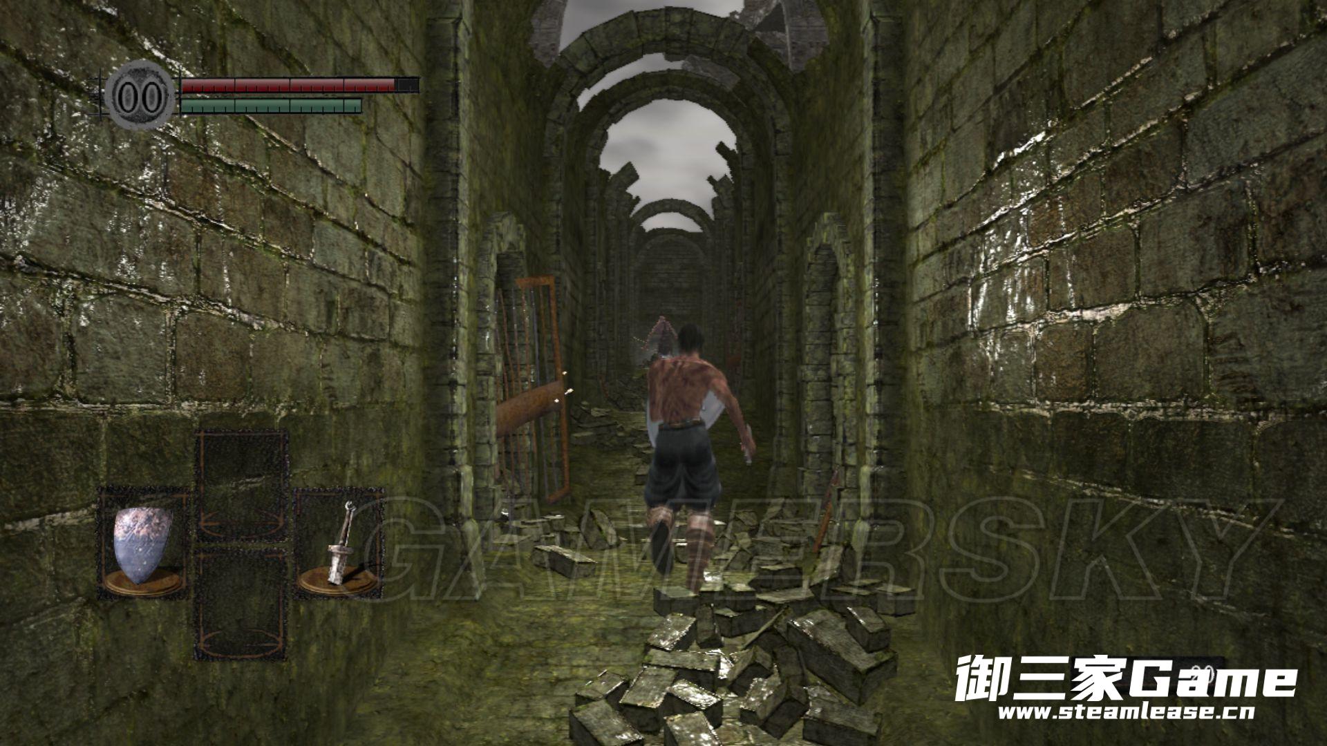 过来的通道里斜坡上一个弓箭手,左侧捡取盾牌【根据所选的职业不同捡取的盾牌也不同】,打开装备面板装备上盾牌后顶盾往上走,上面的弓箭手便会逃跑,上去捡取武器【根据所选的职业不同捡取的武器也不同】。
