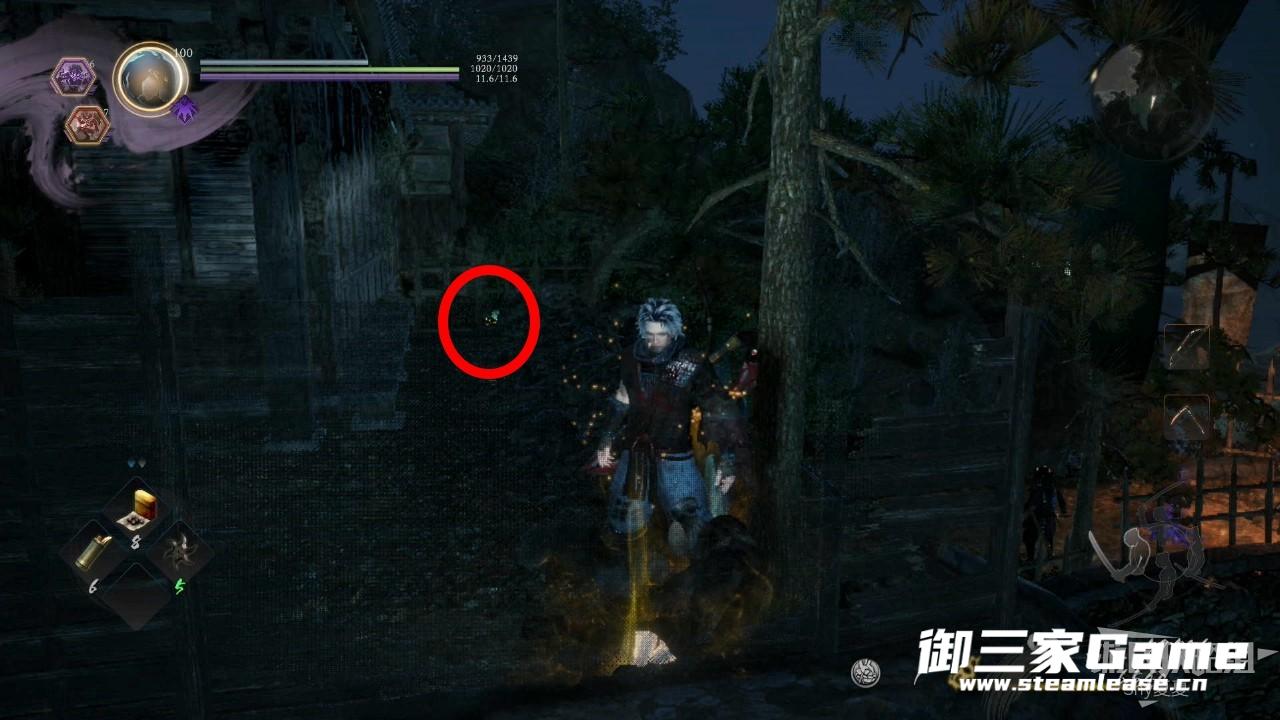 这边收集完成后,就可以从房子后面跳下去了,跳下去向右走,一路上的敌人清理掉下坡,在下图位置红圈处获得木灵(1/6)。