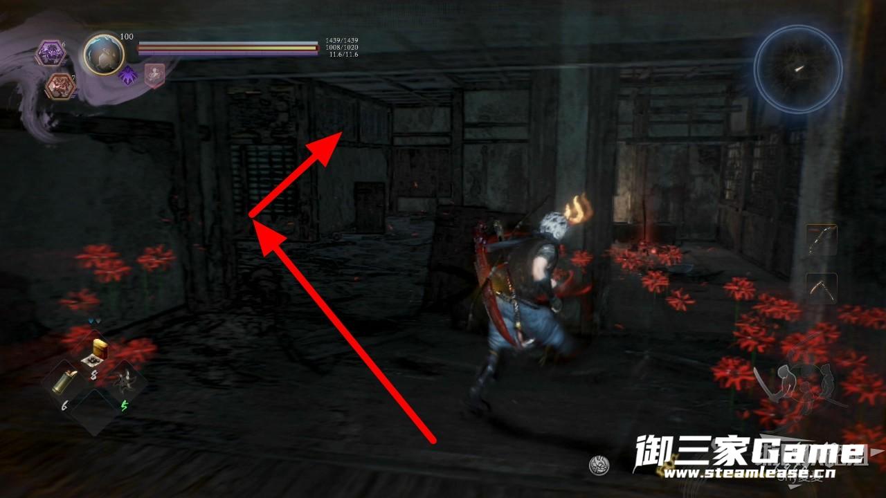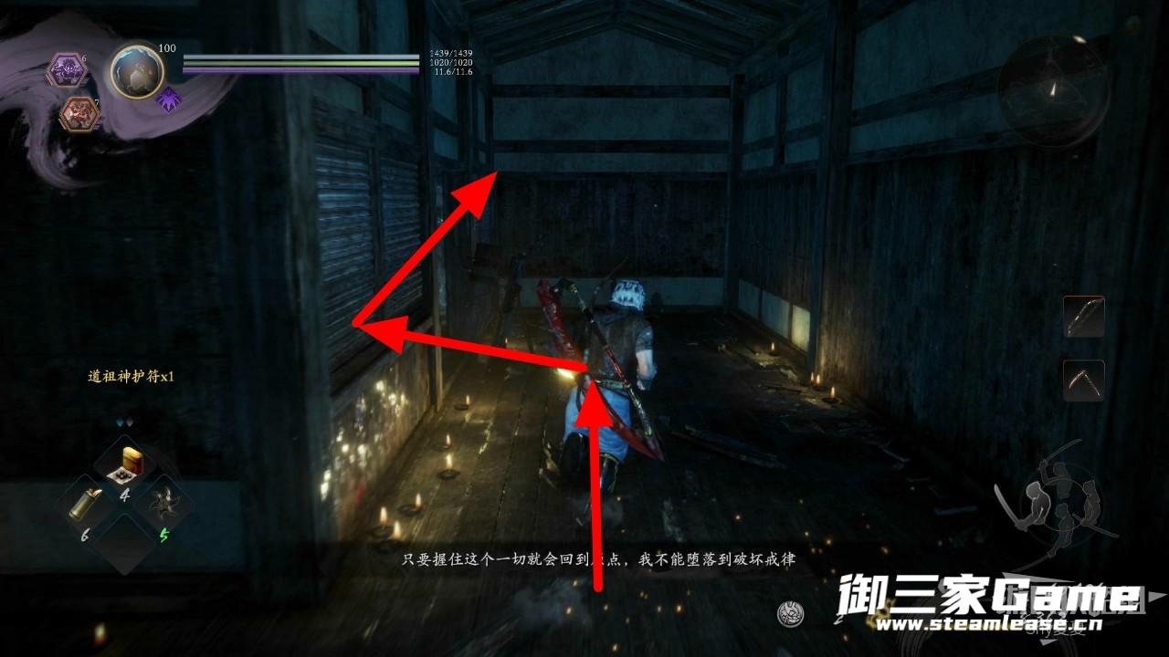 接下来进入屋子,屋子里面是常暗,击杀外道兵破除常暗(2/3),屋内还有一个遗发可以拾取(1/2),从另一边的后门离开,下面几张图是路线。