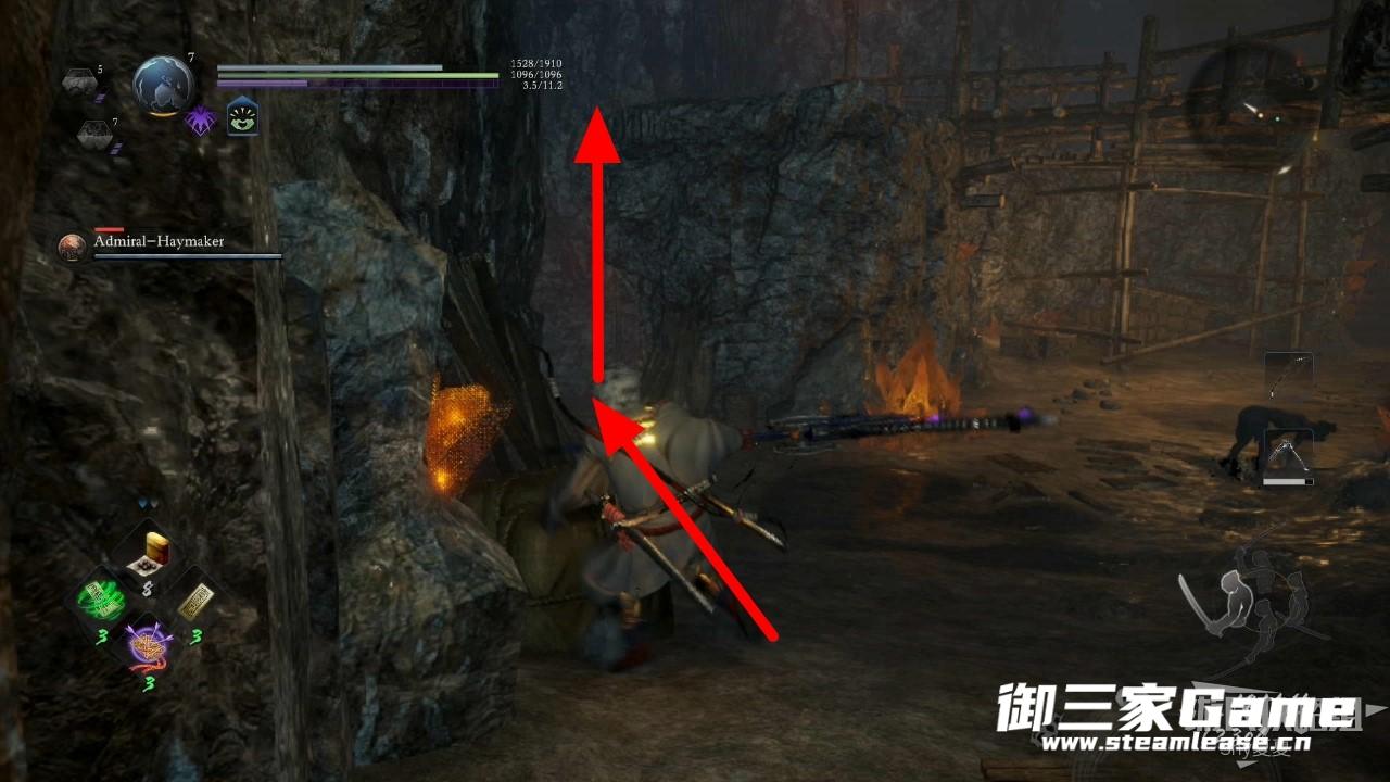 上来之后,在右侧看到一个在挖矿的敷次郎,不要去惹他,而是从左边的缝隙过去,有一个梯子到上层。