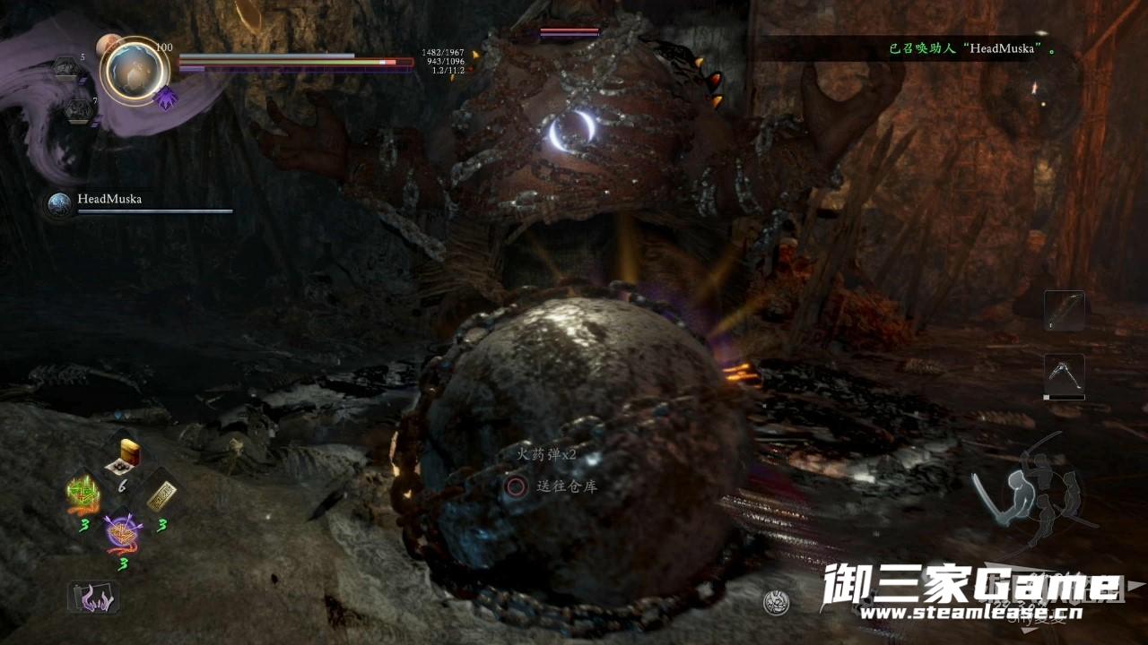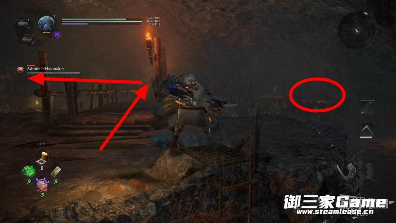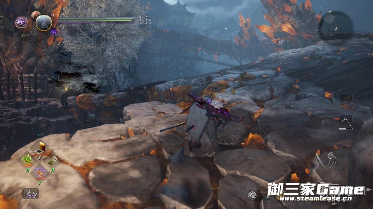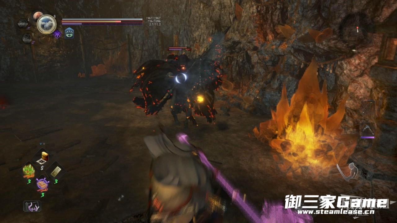 在尽头的台阶处有常世一只名为古笼火的鬼,他近战很弱,所有的攻击都有前摇,只要小心他的投技就可以了,他大招横向喷火的招式可以喷过来的时候妖反,必中。