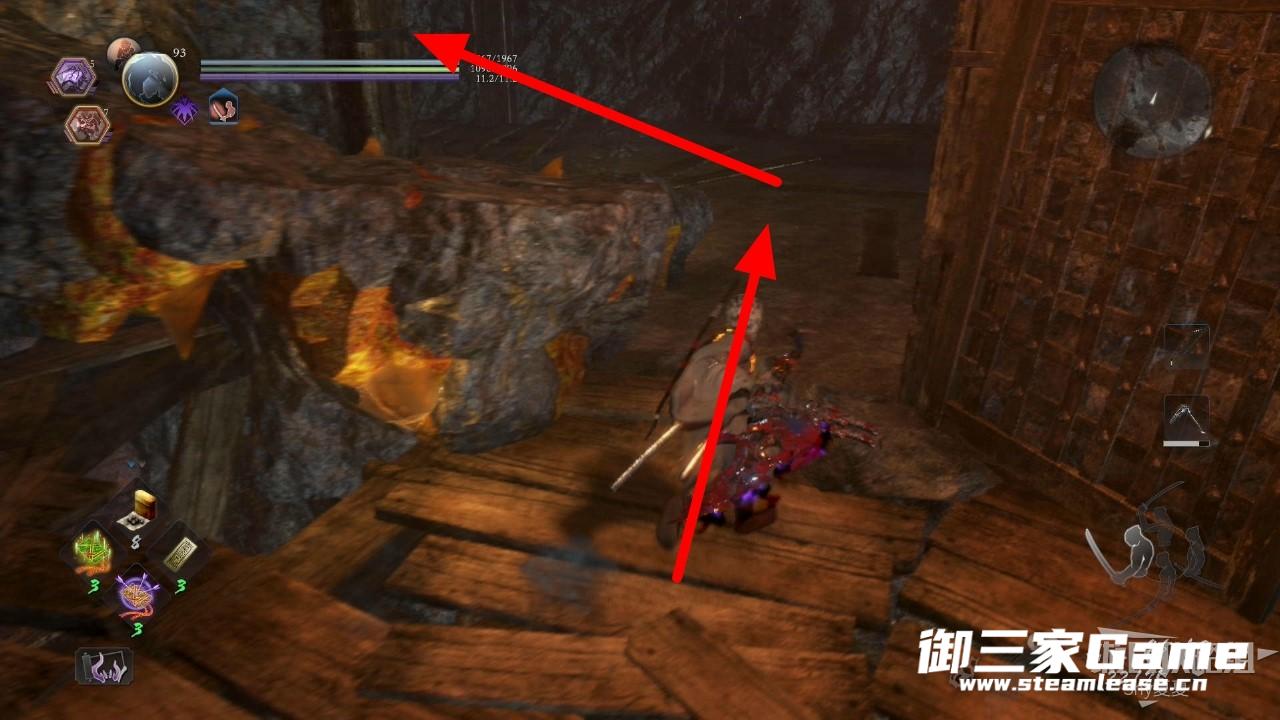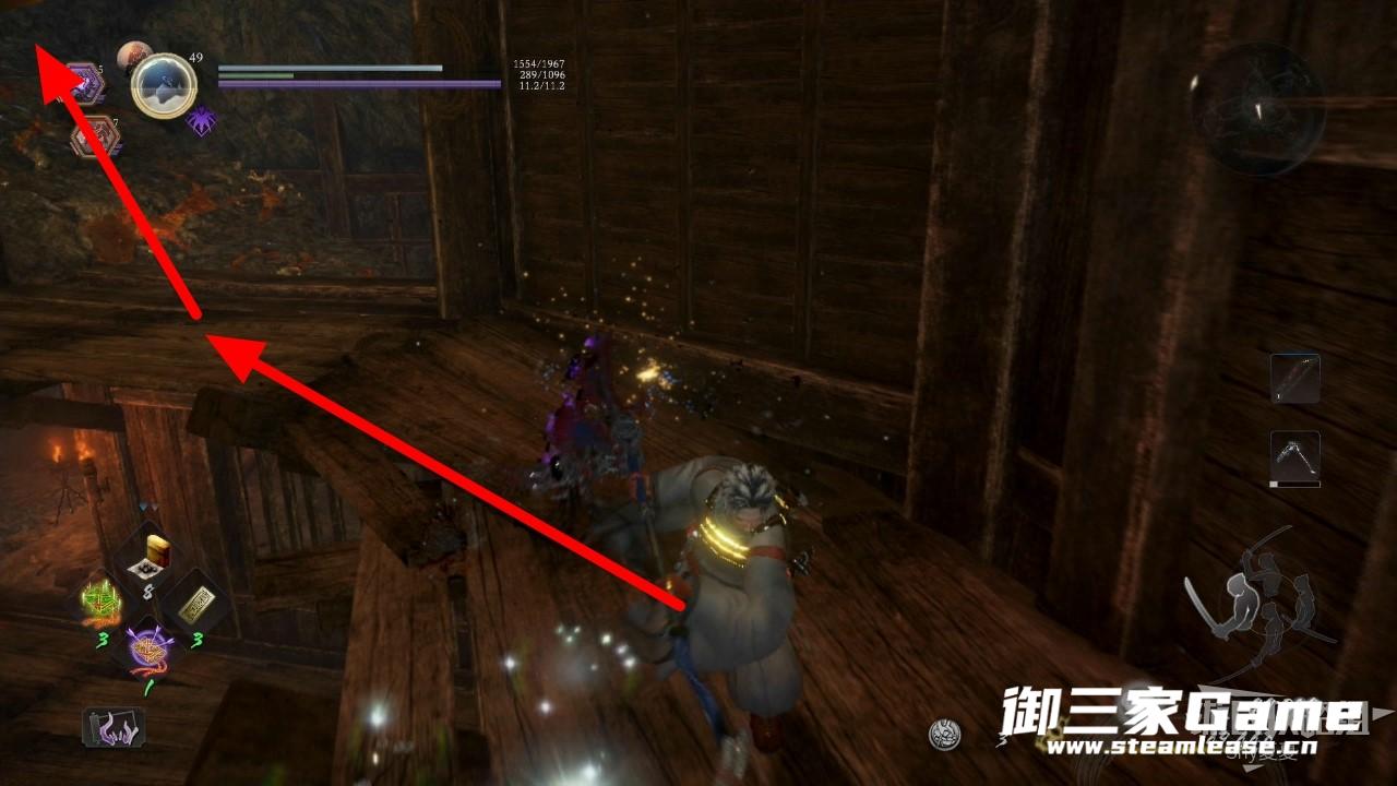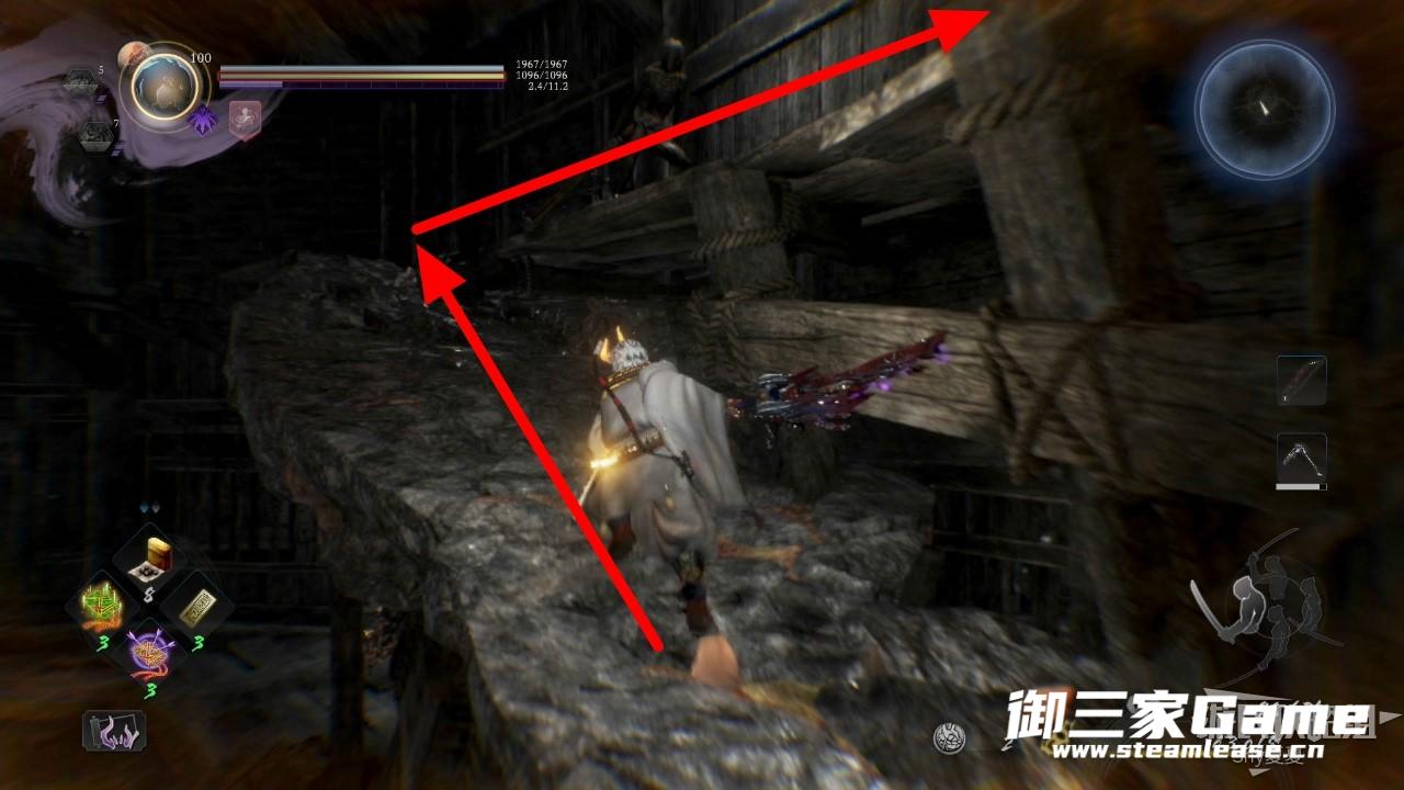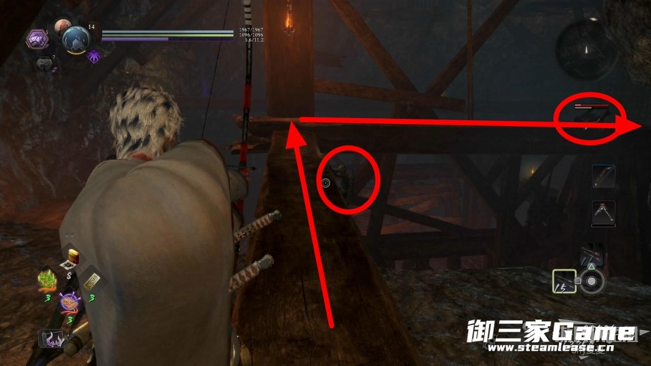 到了上层,站在木梁上的武士先一弓箭杀掉,这时不要急着走木梁过去,而是走到下图位置,把一个扒着木梁的敷次郎打下去,否则走过去会被他袭击。接着按照下图箭头路线从木梁上前进。