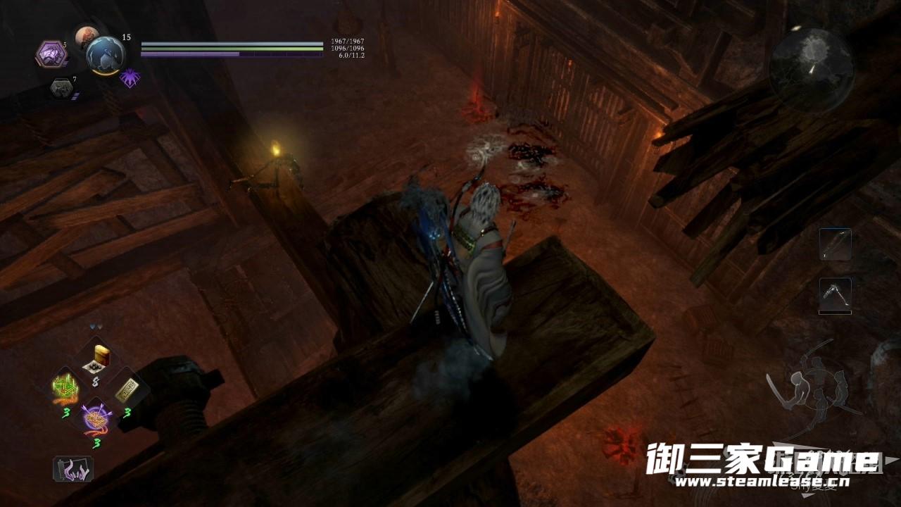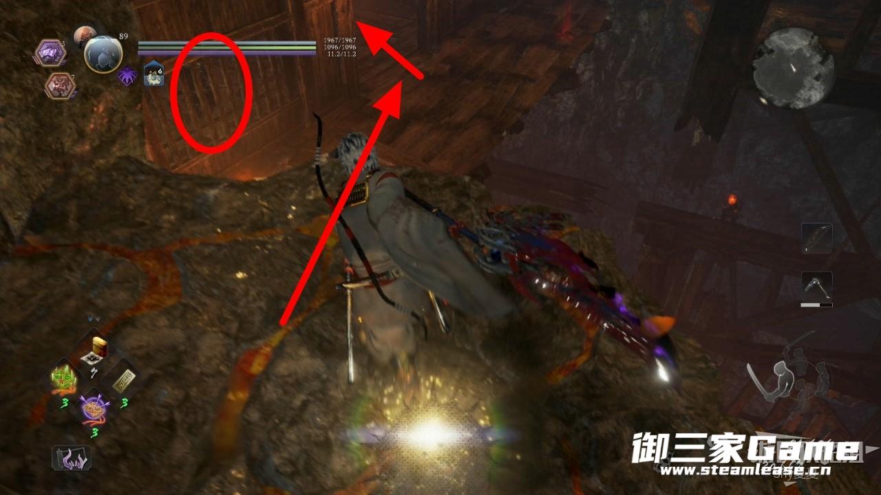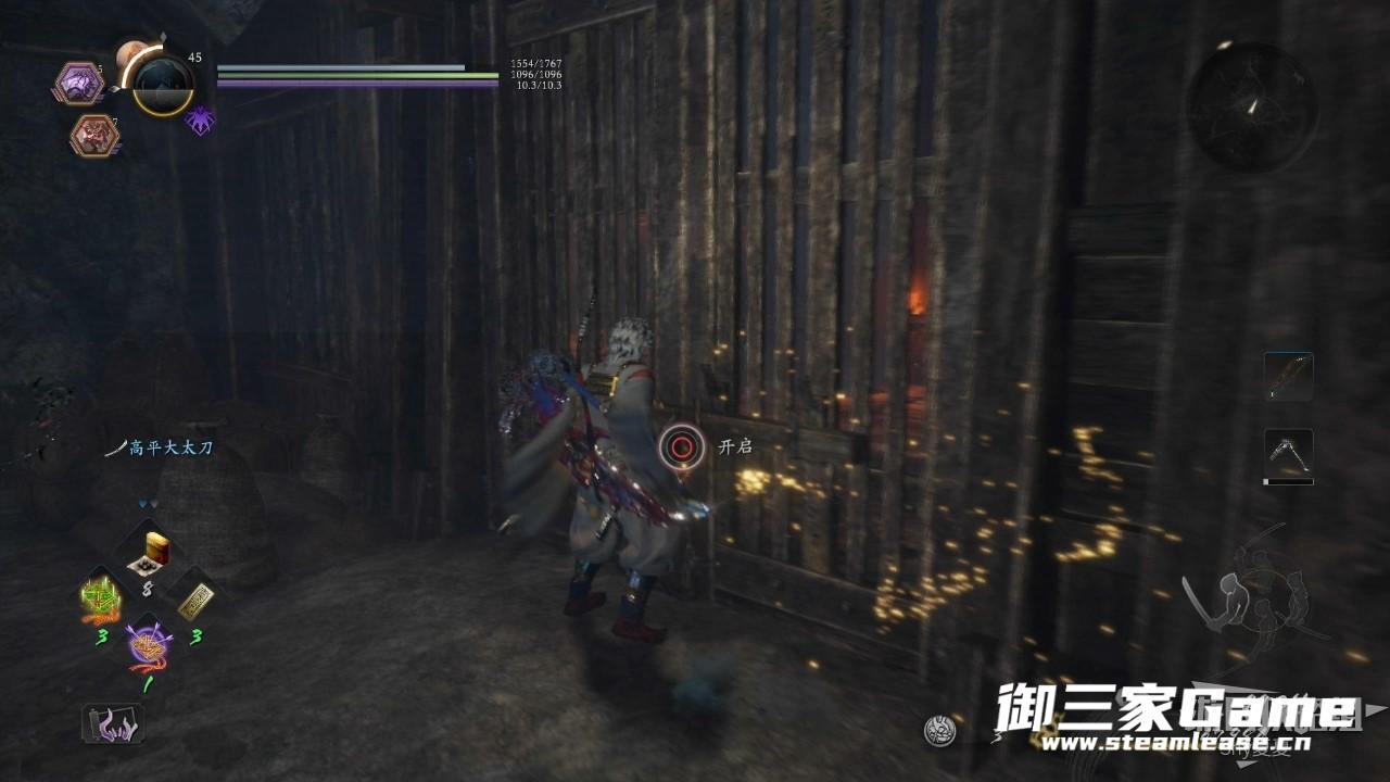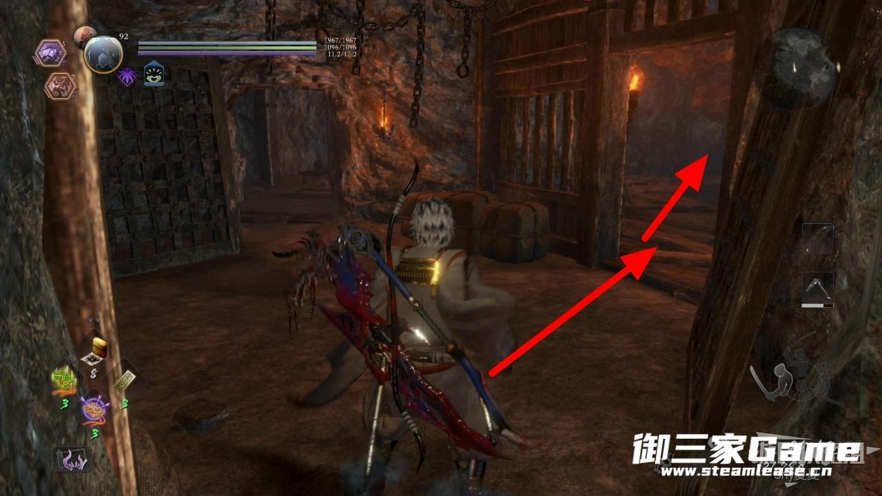 跳下来之后,操作前面的操作杆,把升降梯叫下来,这段过程中,可以去旁边的门(有一个锁着的门,等之后再进来)里杀两个武士,深处还有一个魑魅,贿赂一下,就可以回到升降梯,才中间凸起的木板,升降梯就会启动,来到上层。