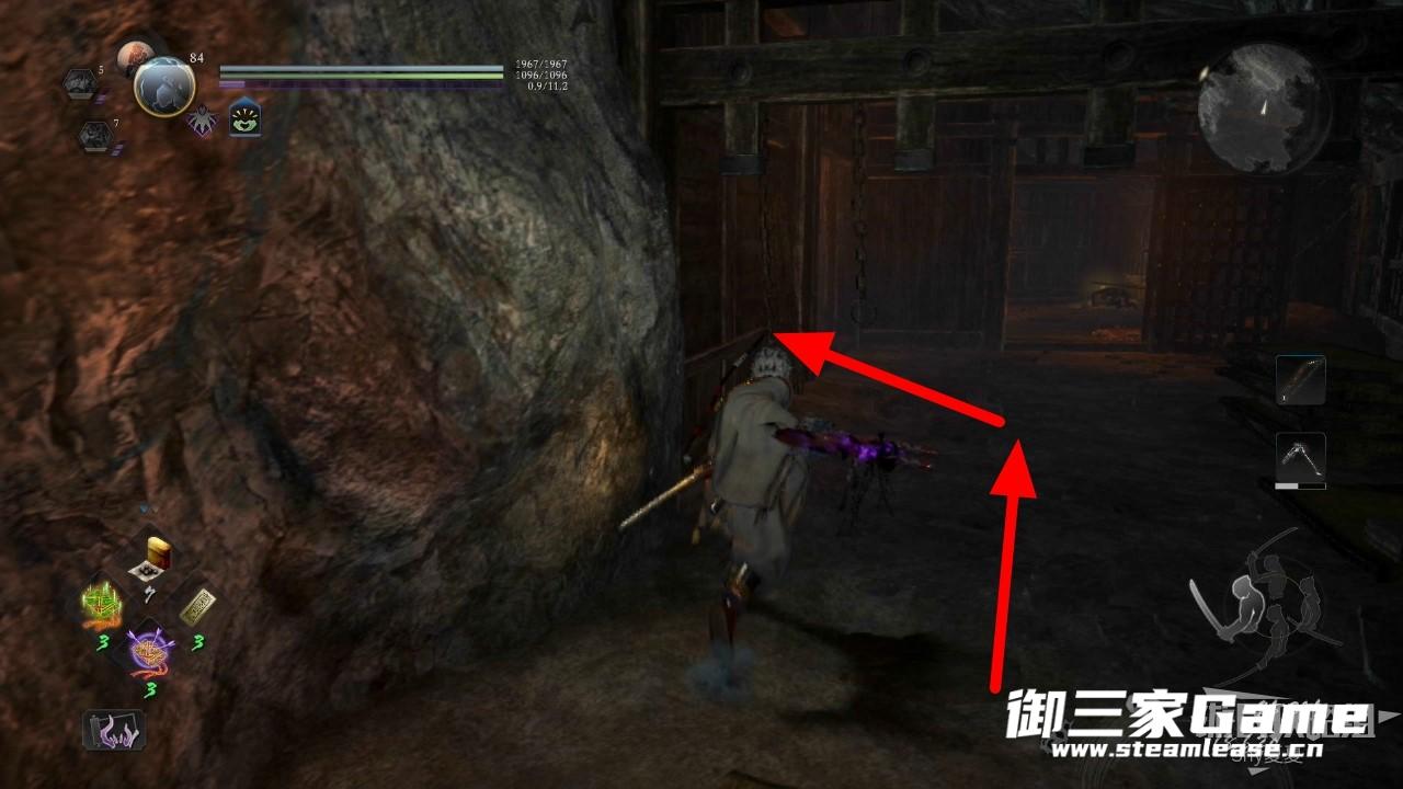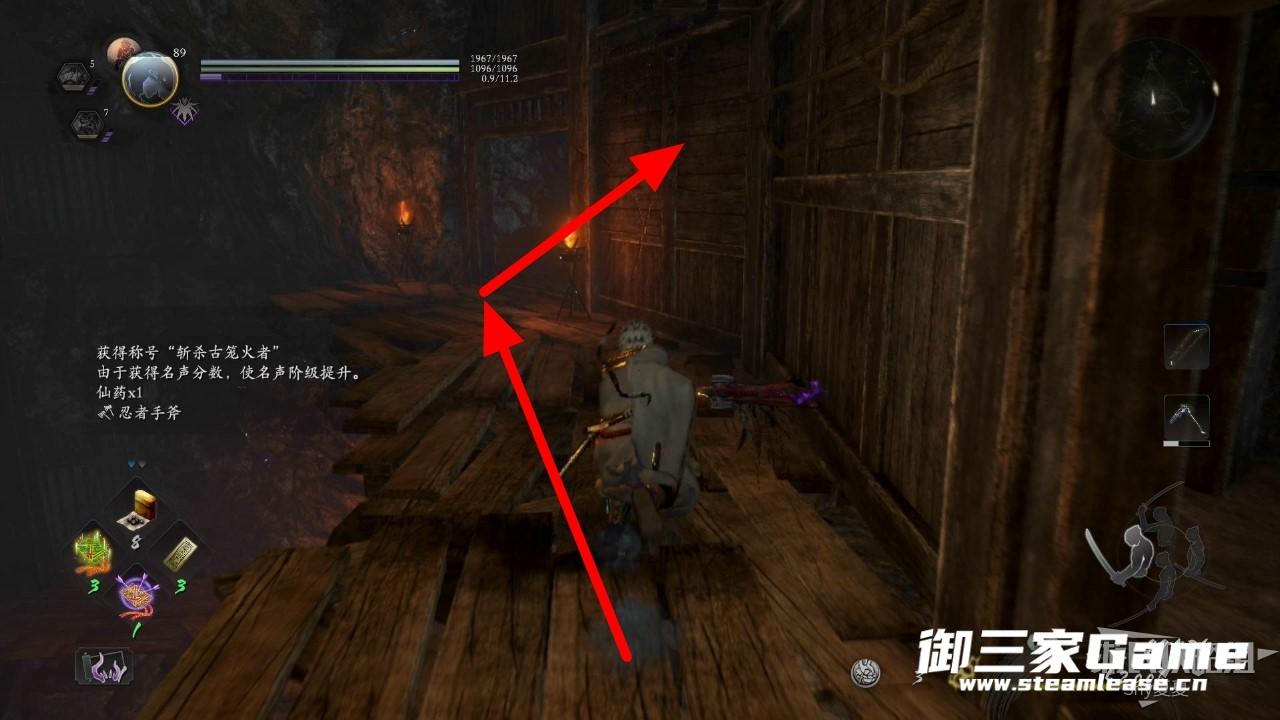 杀掉武士之后,不要急着上坡,而是进入屋子,走到左侧尽头。