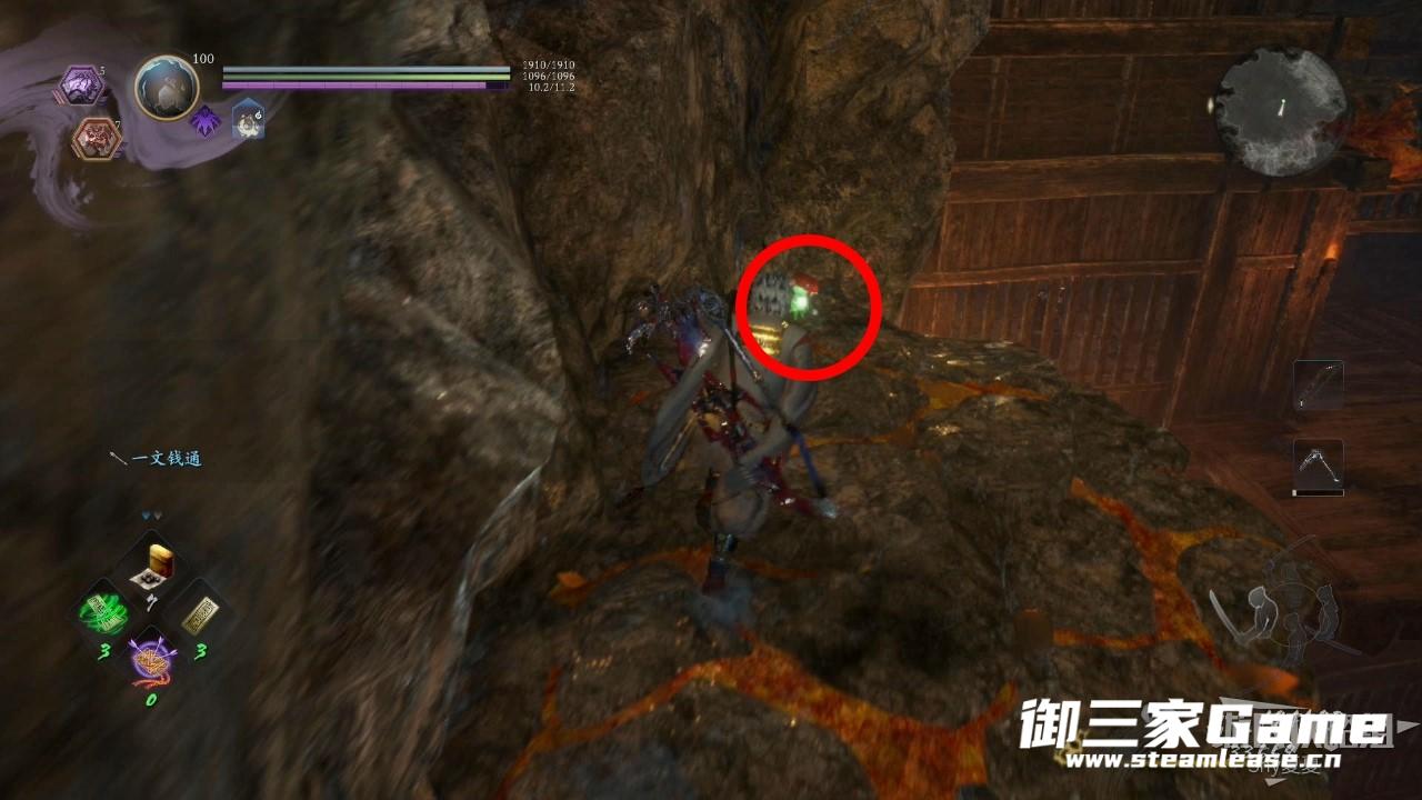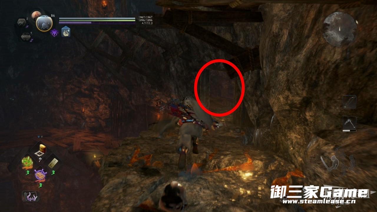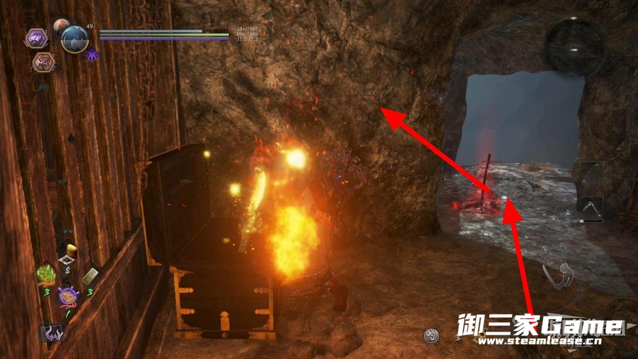 上来之后,打开一个宝箱,向左走(这时去外面,下坡可以看到一个宝箱,拿了不要继续走,回到下图位置),会看到一个古笼火。