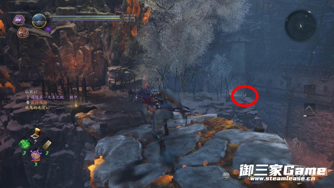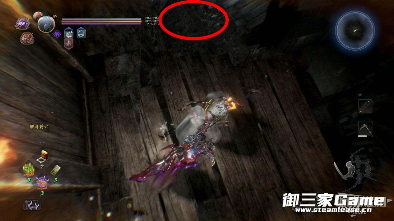 杀掉之后,打开宝箱获得遗发(1/2),回到上层,来到之前跳木梁去打怨灵鬼之前的屋子,走上斜坡。