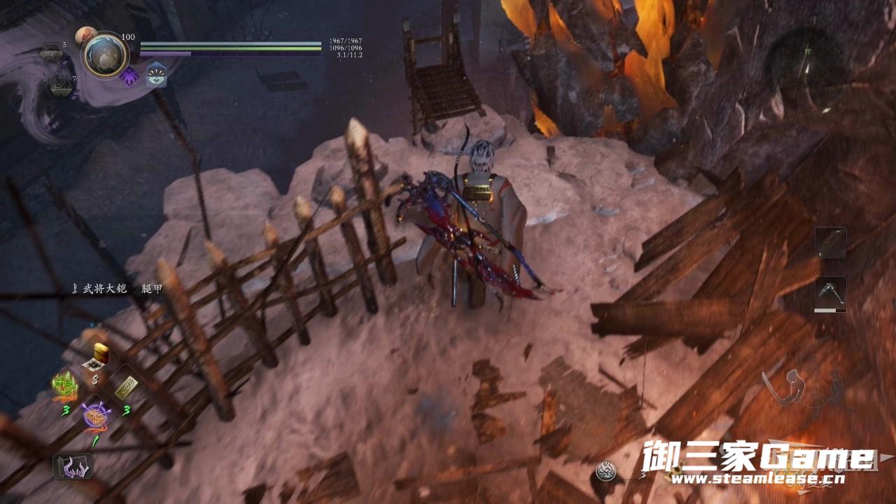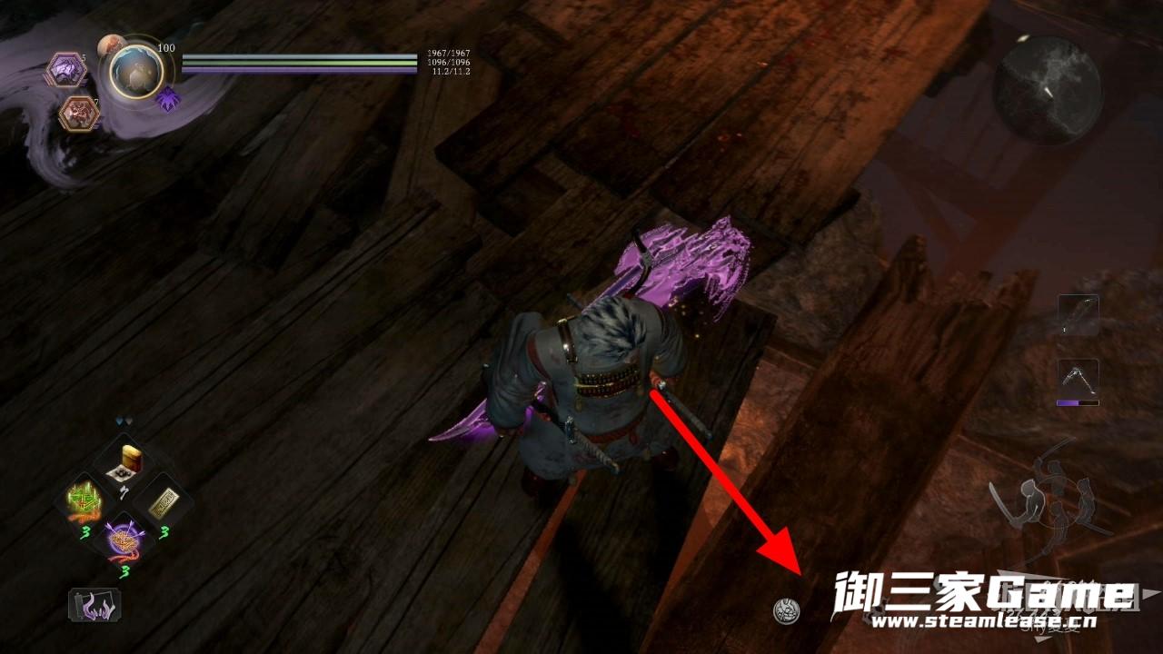 到达木梁尽头后,跳到左侧木梁可以拾取道具,下方的常世里面是一只猿鬼,非常好对付,杀掉猿鬼之后,就能打开后面的门了,后面的门通往第一个神社旁的楼梯处。