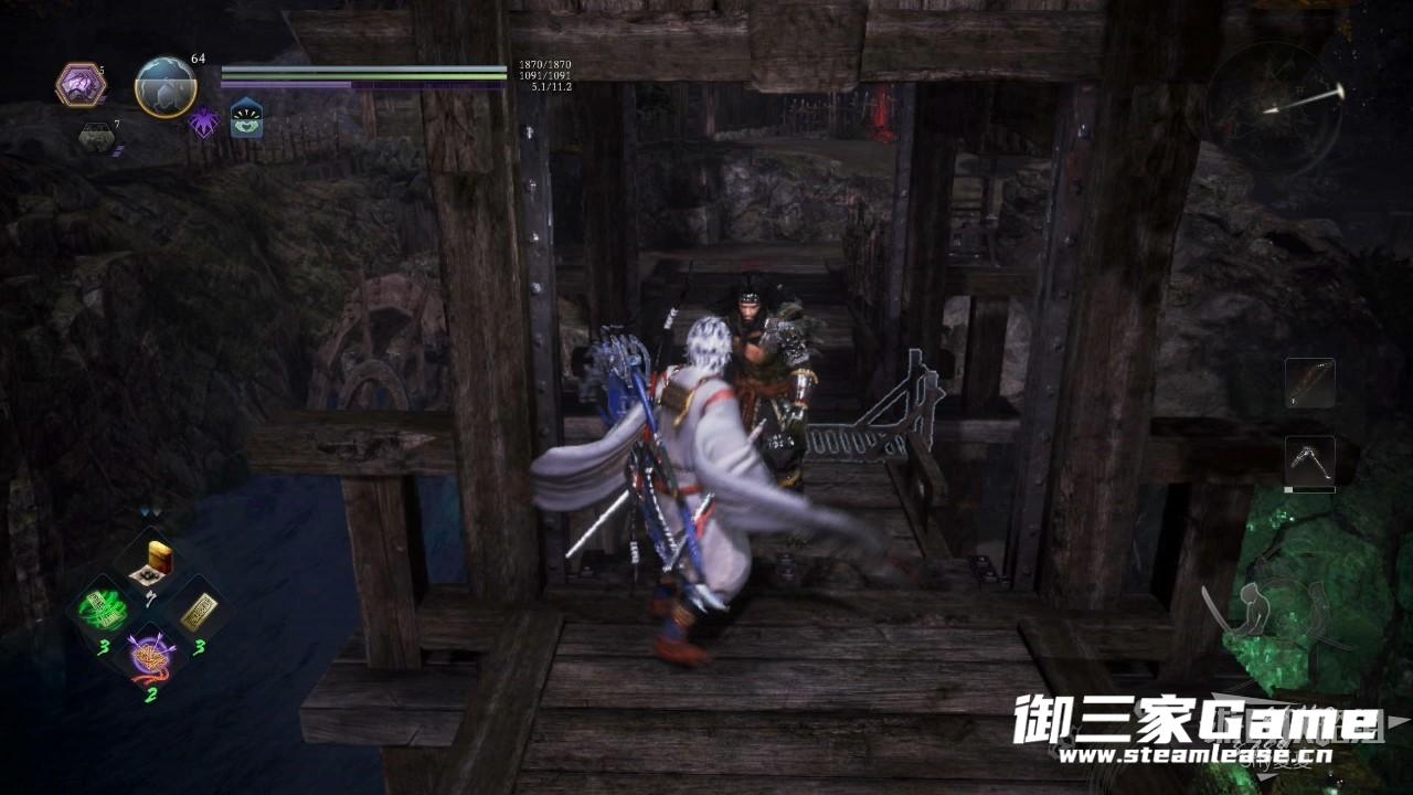 穿过屋子,在阀门处有一只乌鸦天狗,杀掉他才能打开阀门,这里比较狭窄,所以打起来难度还是很高的,尽量让队友去战斗,自己偷偷砍。