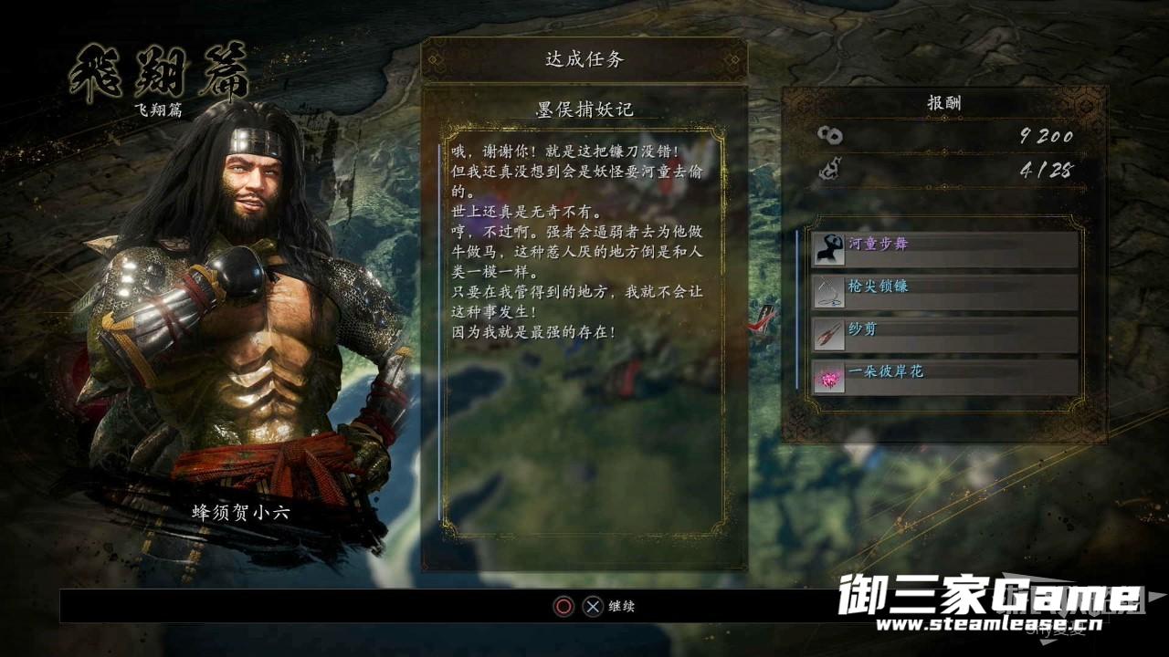 报酬:枪尖锁镰、河童的背甲×1、乌鸦天狗的羽毛×1、一朵彼岸花×1、金钱9200、精华4128