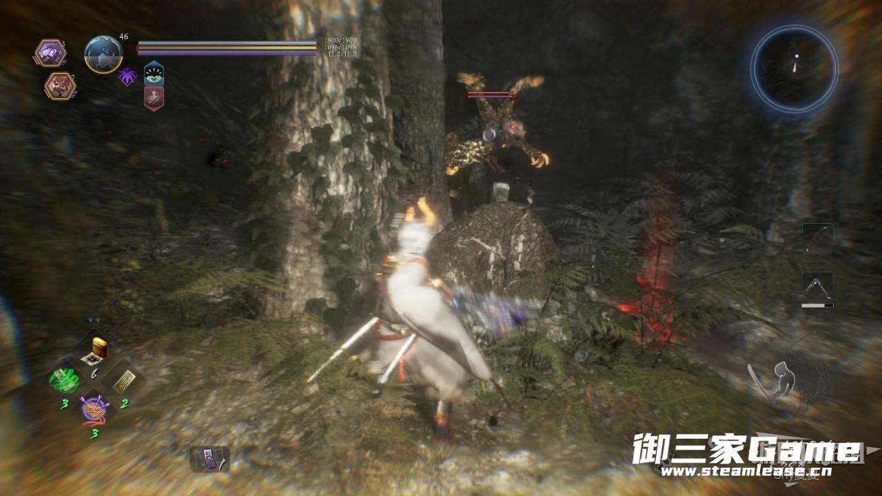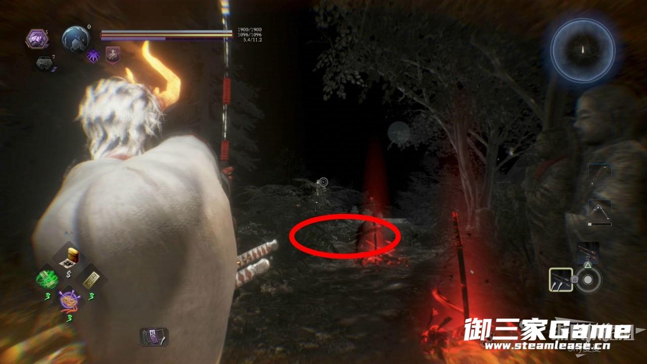 到了最下层不要以为只有一个乌鸦天狗,树上还有一个猿鬼,地上还有两只饿鬼,把这些都清理完,再和乌鸦天狗单挑,单挑结束后破除常暗区域,拾取这个区域的宝箱获得勾玉。