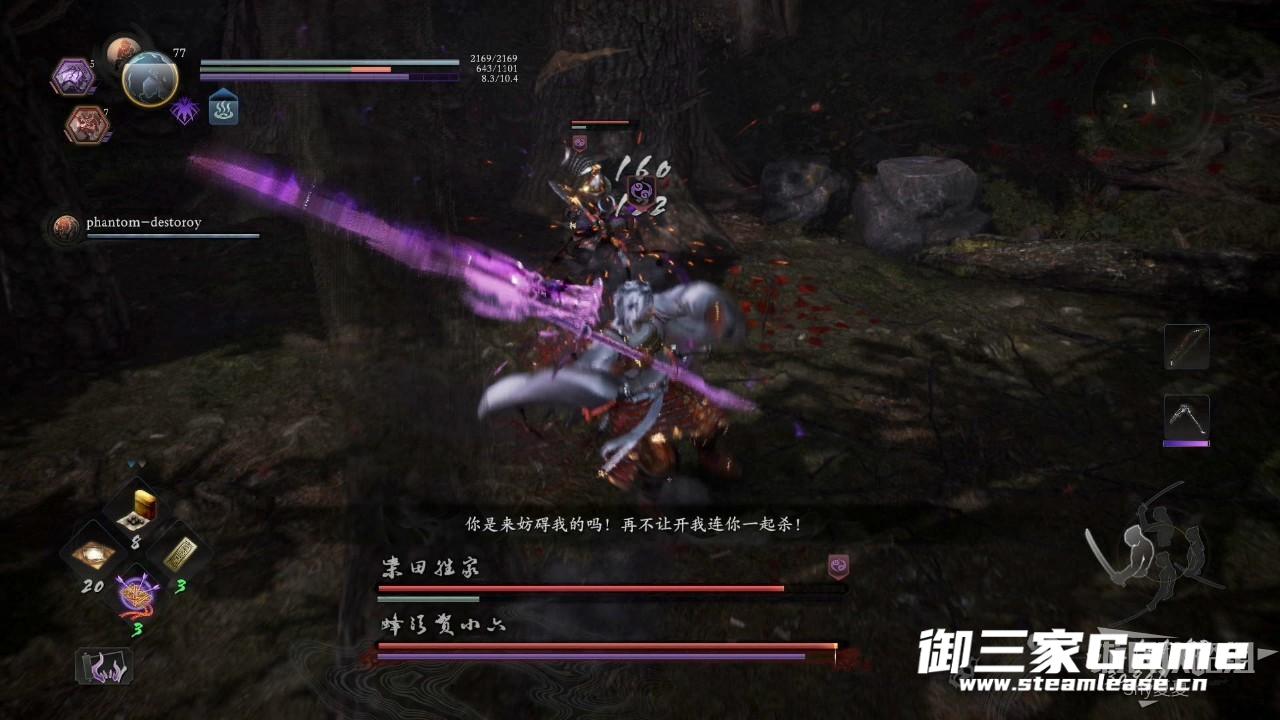 这场BOSS战需要让队友去和柴田胜家单挑,自己和小六单挑,如果反过来,很可能我们还没打完,队友就被小六打死了。这里小六使用的是锁镰,所以一定要躲避他的攻击,被勾住很容易被打死(玩过王者荣耀的,脑补一下百里玄策的技能,几乎一样)。