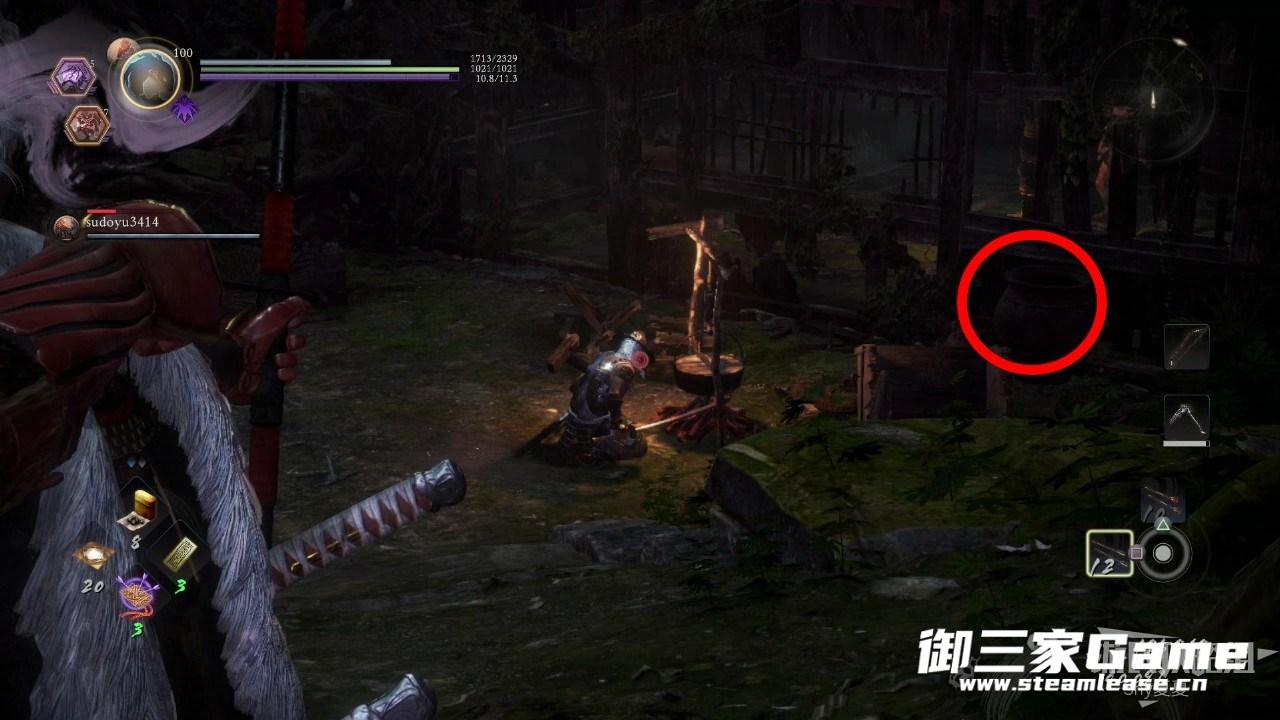 击杀武士之后向左看,可以看到一个屋子,在上方可以利用弓箭击杀一部分敌人(特别是屋子里有一个没头盔的敌人,可以一箭秒了),屋内可以打开一个宝箱,屋外的罐子里拾取木灵(3/7)。
