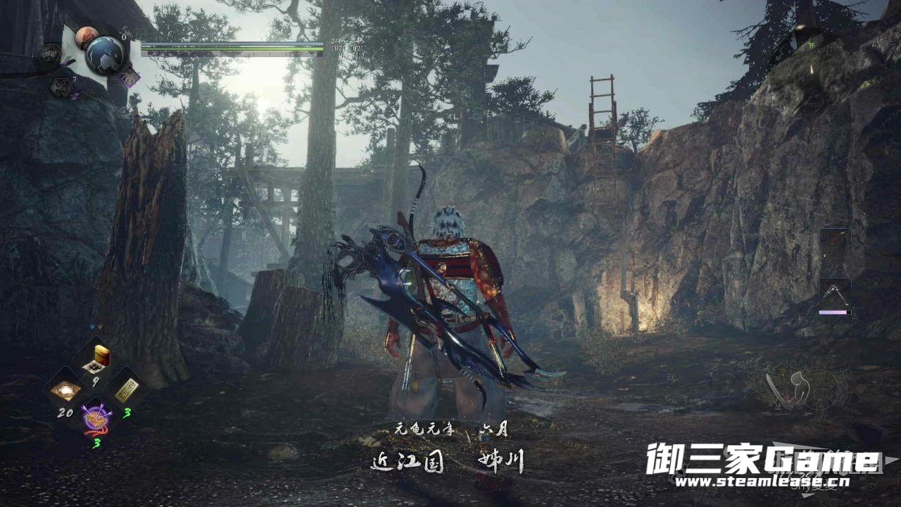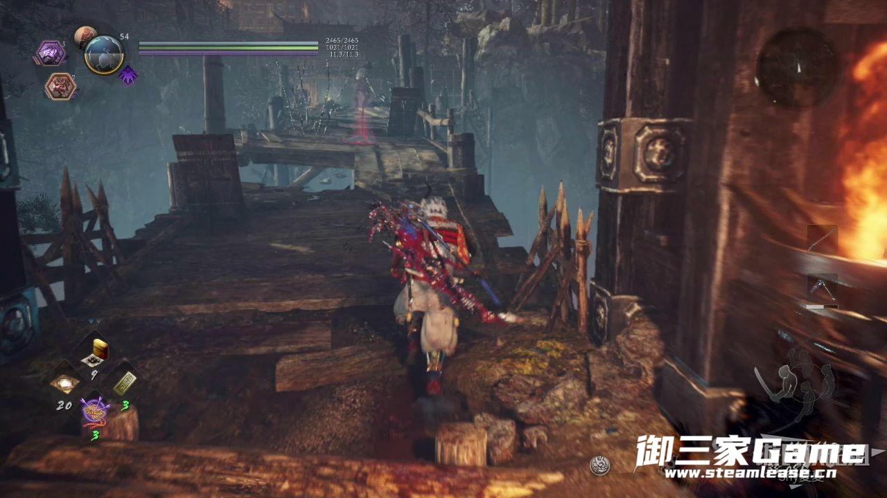 再往前走,就是一个破损的木桥,木桥上有一个使用长斧的骷髅兵,击杀之后,就可以过桥了,过桥之后,无明离队,并且看到第二个神社,休整一下。