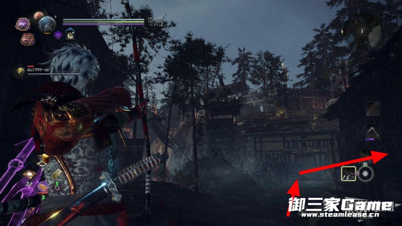 上来之后,利用弓箭击杀一些敌人,然后在下图右侧的房子后面绕过去上坡。