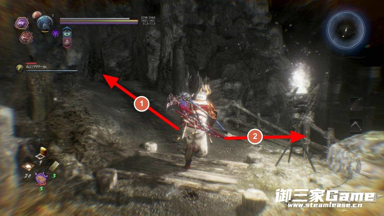 上来之后,进入常暗,直接向右走2号道路,走到到头就能看到开局的梯子了,踢下去。然后返回下图走左边的1号道路。