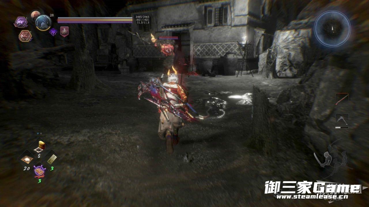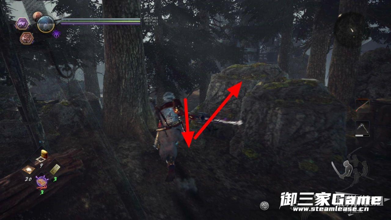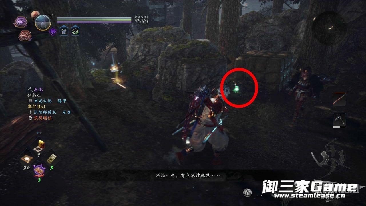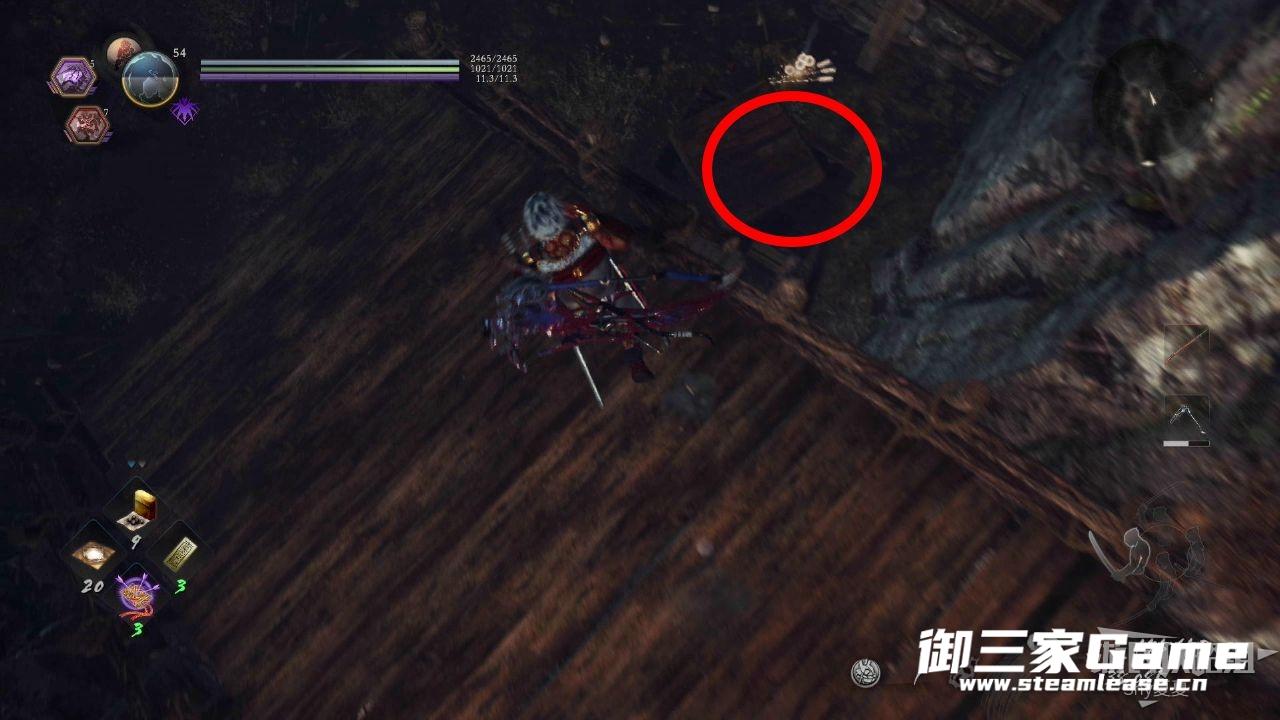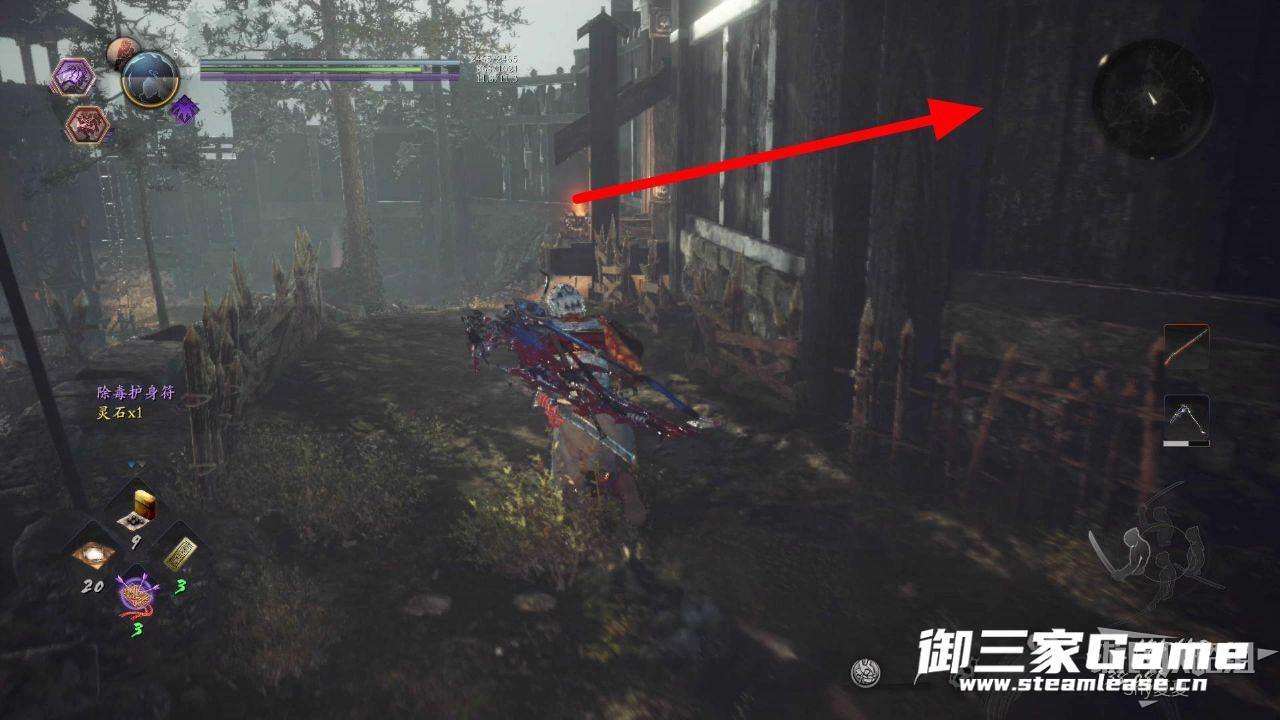 走过来之后,继续上坡,就能看到一个房子,里面有一只猿鬼,将其击杀破除常暗(1/3),在屋外可以看到一个木灵(1/8)。
