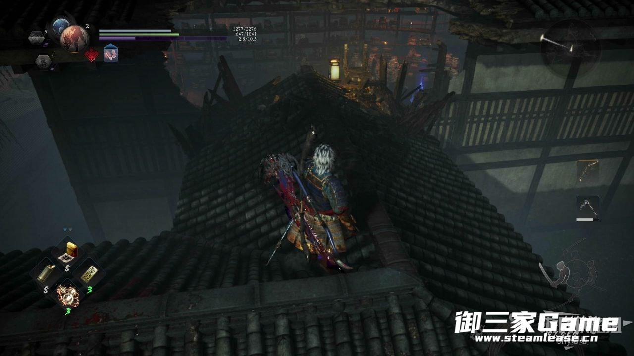 击杀右边的一只妖鬼后,可以看到第二个木灵(2/3),拾取后爬梯子返回,来到另一侧房顶(也就是爬上三面八目旁边梯子的右边)。