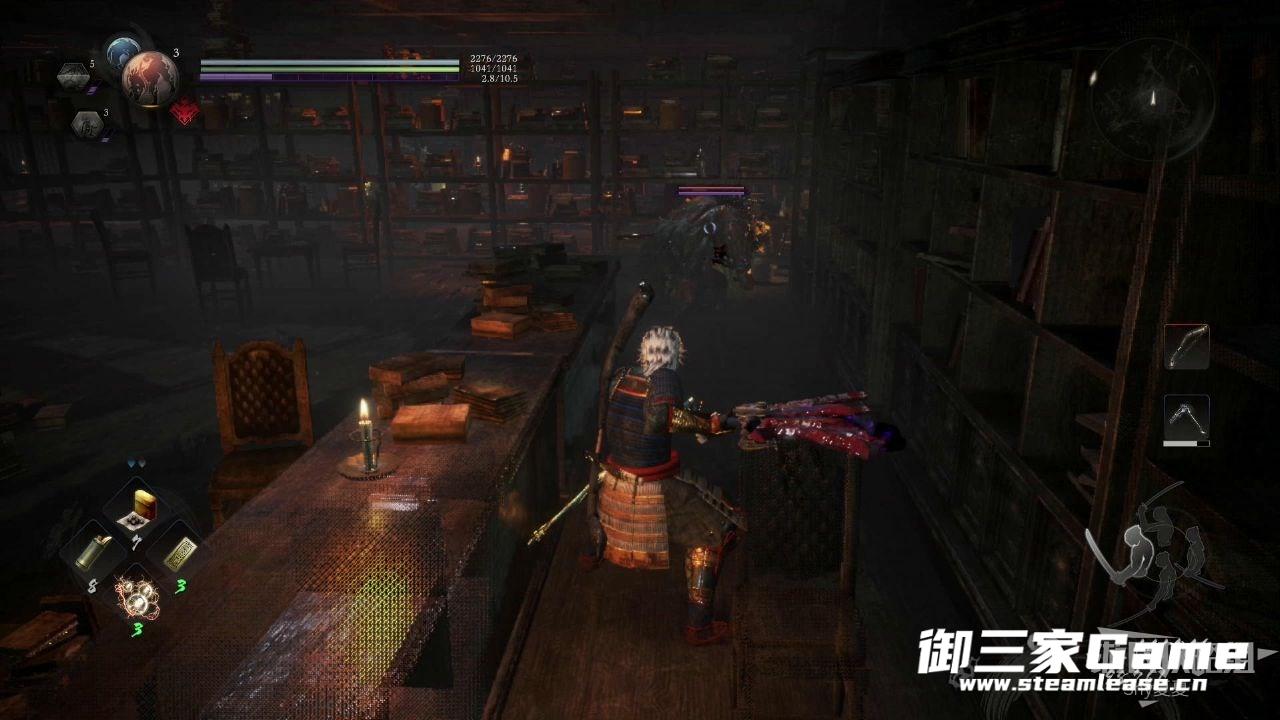 上来之后,往左走,从屋顶进入一个书房的屋子,屋外有两个忍者。