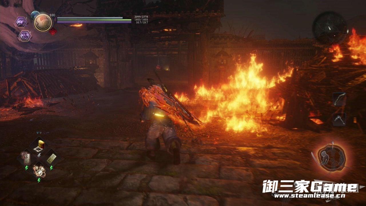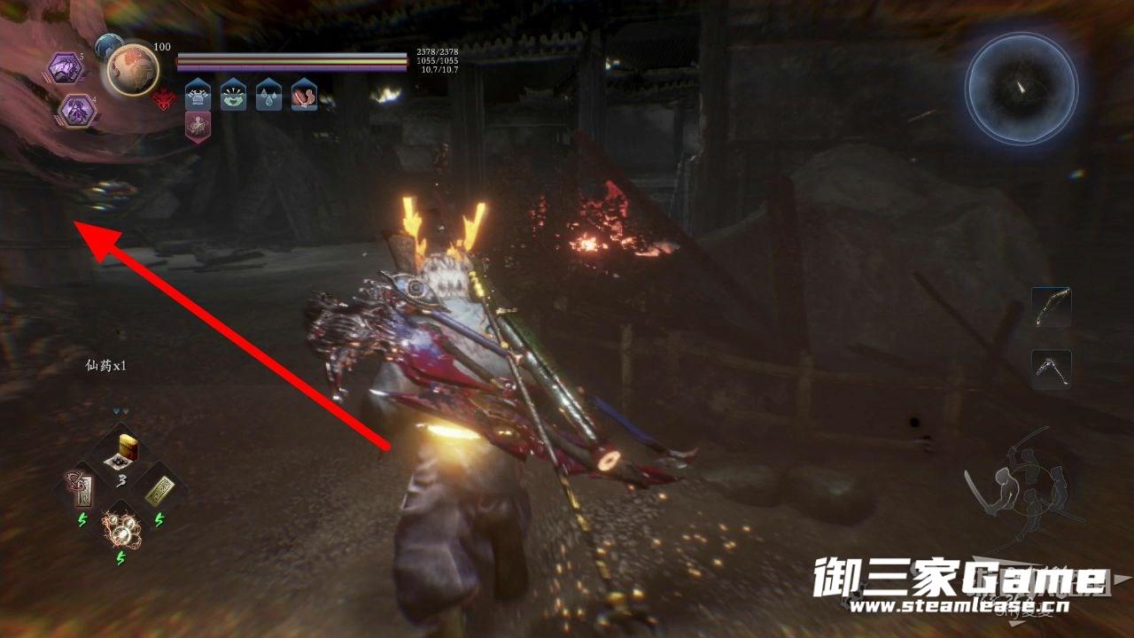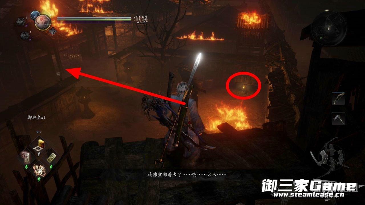 从台子上跳下来之后,红圈处的道具前有一团火,如果想通过,可以打破火旁边的水桶,这样就会获得耐火的BUFF,有了这个BUFF可以短暂的穿过火焰。拾取后往左走。