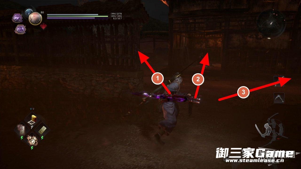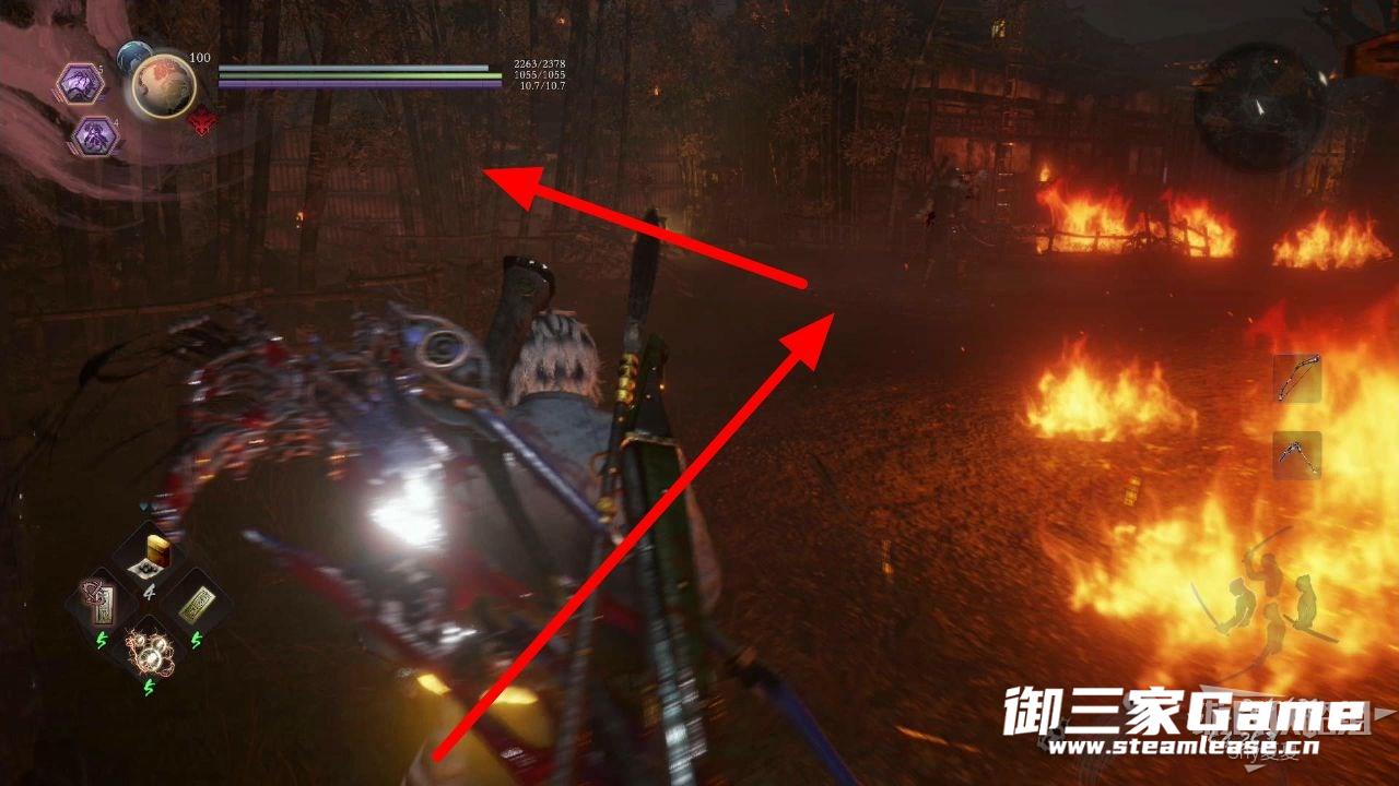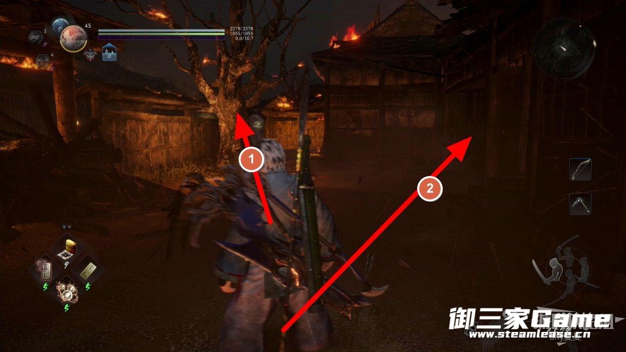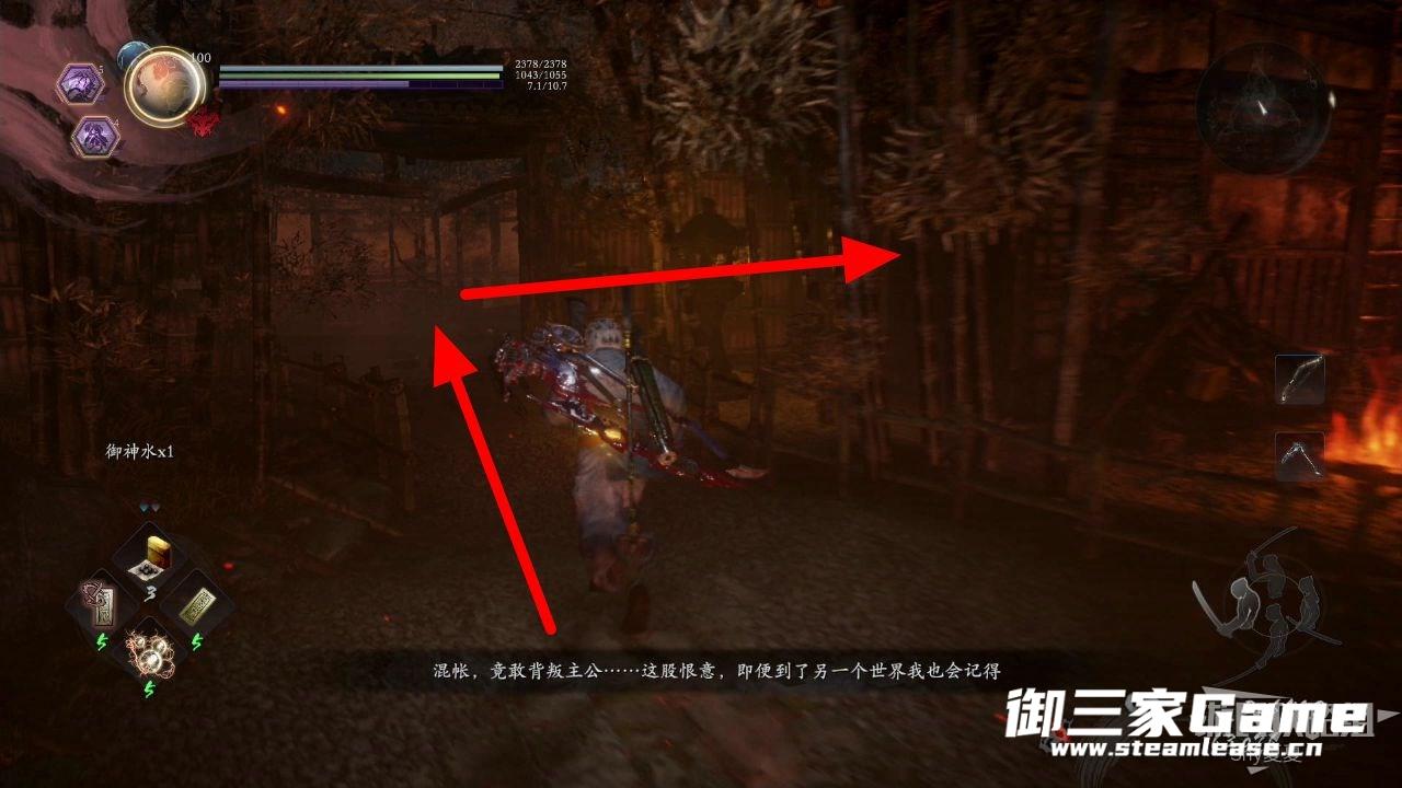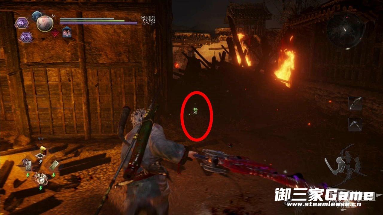 不要进入房子,贴着左边的墙一直走,看到下图的武士(辘轳鬼)将其击杀,沿着箭头前进。