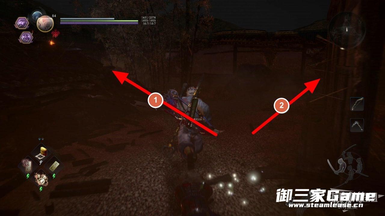 到了下图之后,左转走1号道路可以去打开神社旁的门,回到第一个神社休整,向右走2号道路则继续前进。