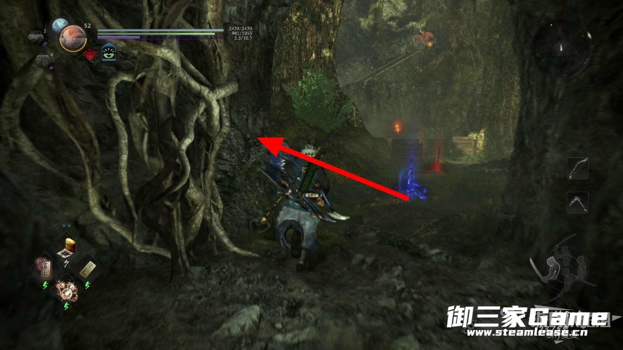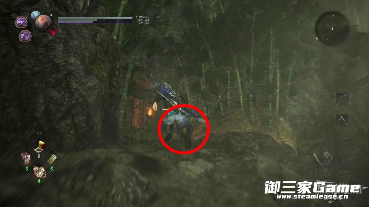 开局之后沿着悬崖边向上走,下图红圈处有一个亡骸武者,击杀之后回头。