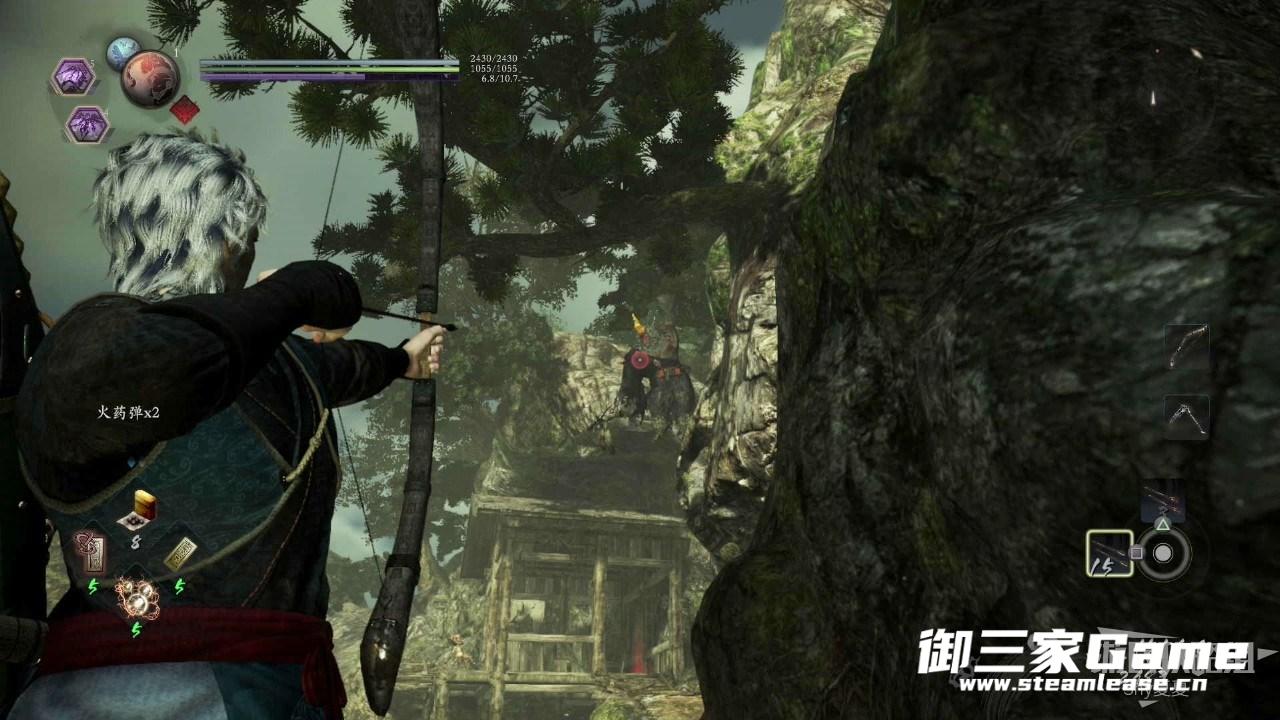 转过来可以看到一个山姥,在前面的楼梯中间有一个弓箭手,用弓箭将其击杀,然后到楼梯下方,楼梯顶端有一只要推球的独眼鬼,用弓箭打一下石球,球就会滚动下来。