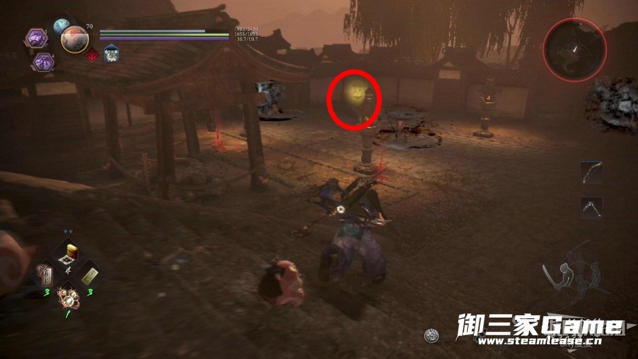 出来之后进入战斗,首先击破下图红圈处的灯,否则会一直出鬼火,第一波敌人:饿鬼、小独眼鬼;第二波敌人:油伞妖、饿鬼;第三波敌人:大饿鬼、饿鬼,全部击杀之后,门就打开了。