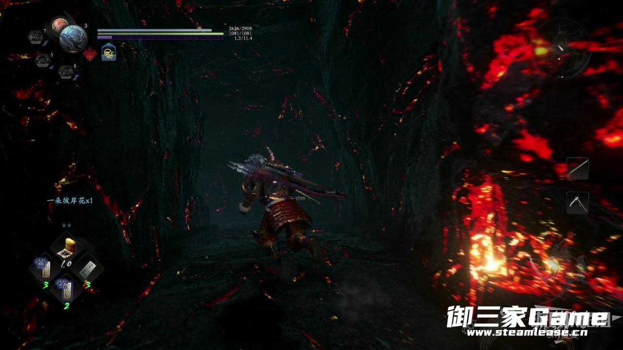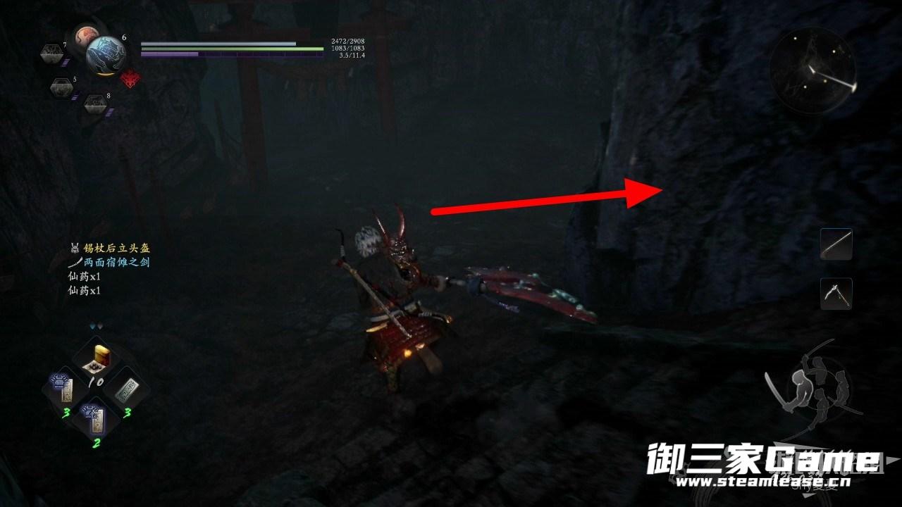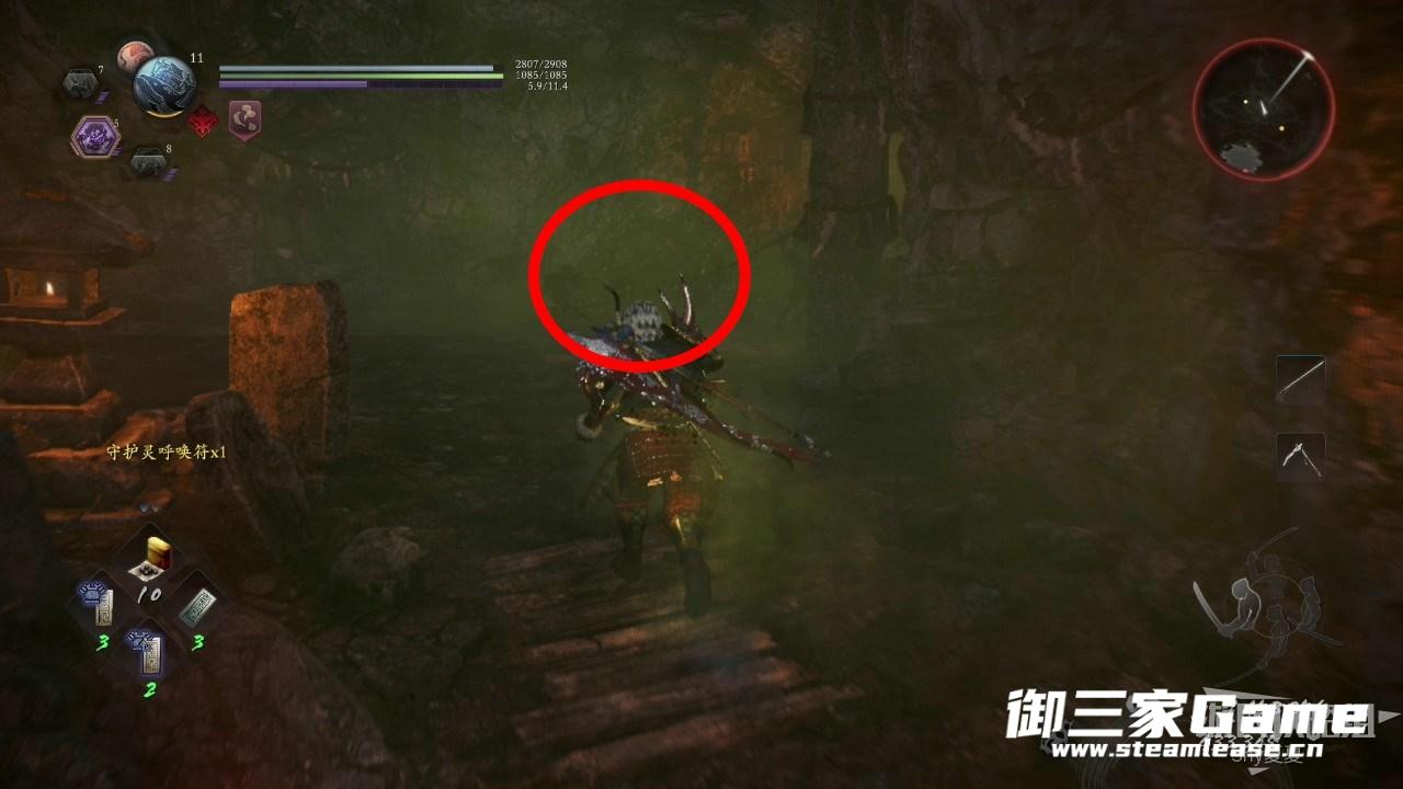 再往前走就能看到第二个神社,休整之后继续前进。通过长廊的时候往右看,有一个能跳下去的洞,跳下去。