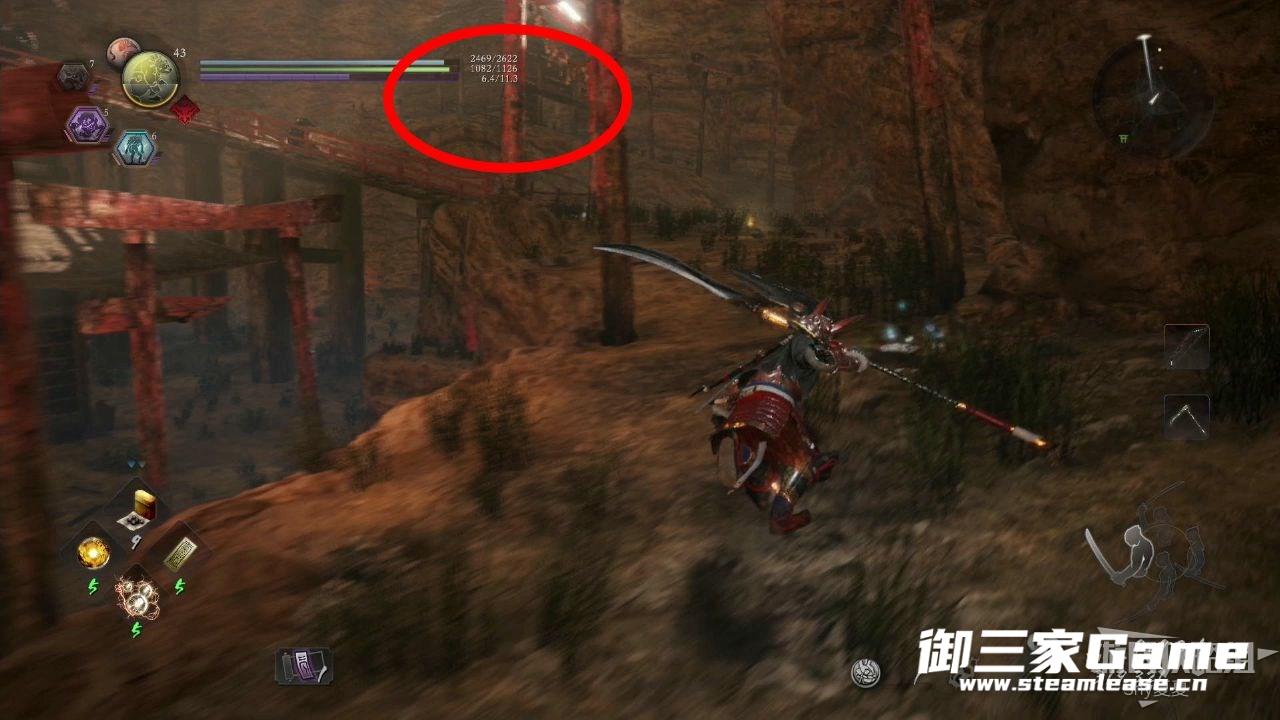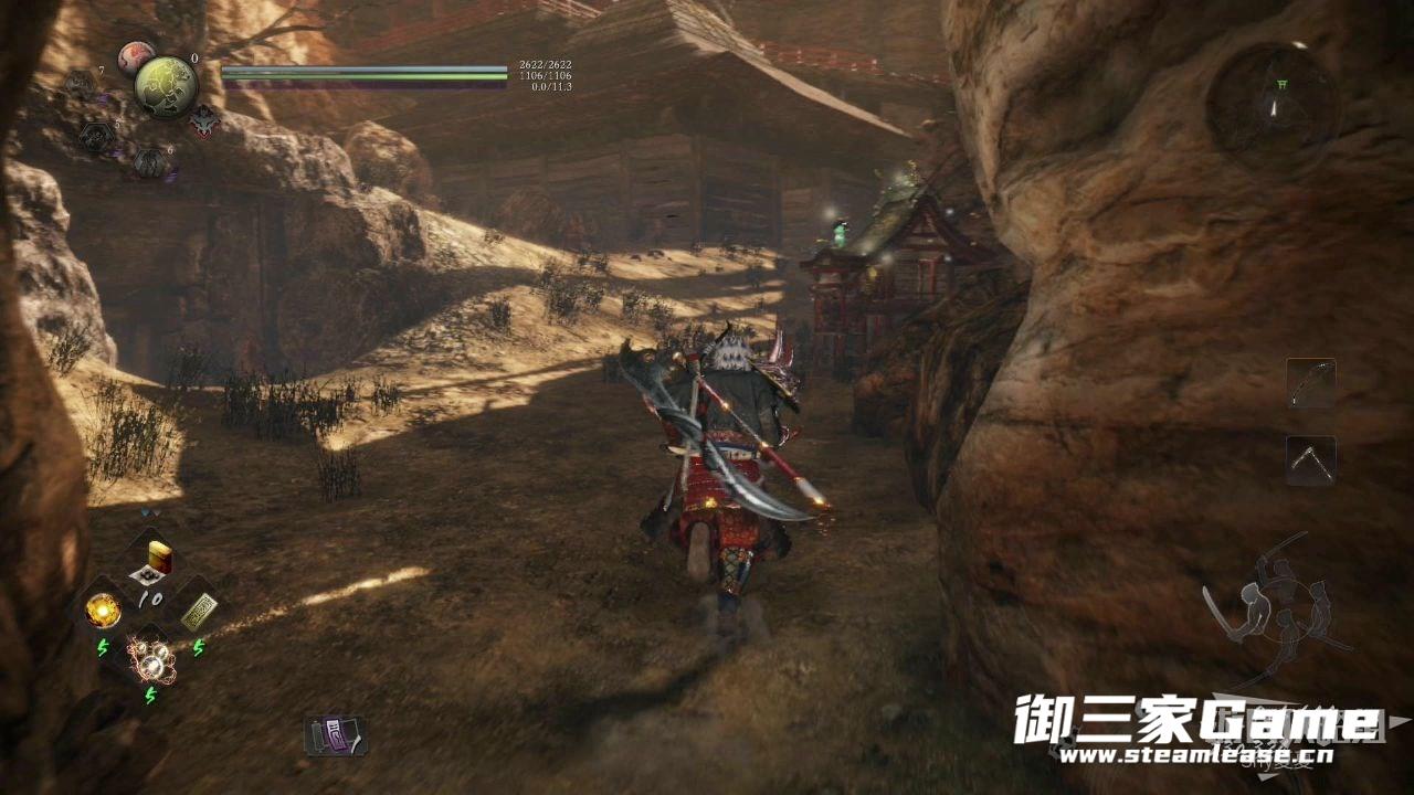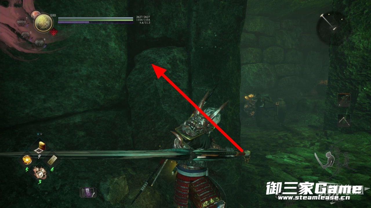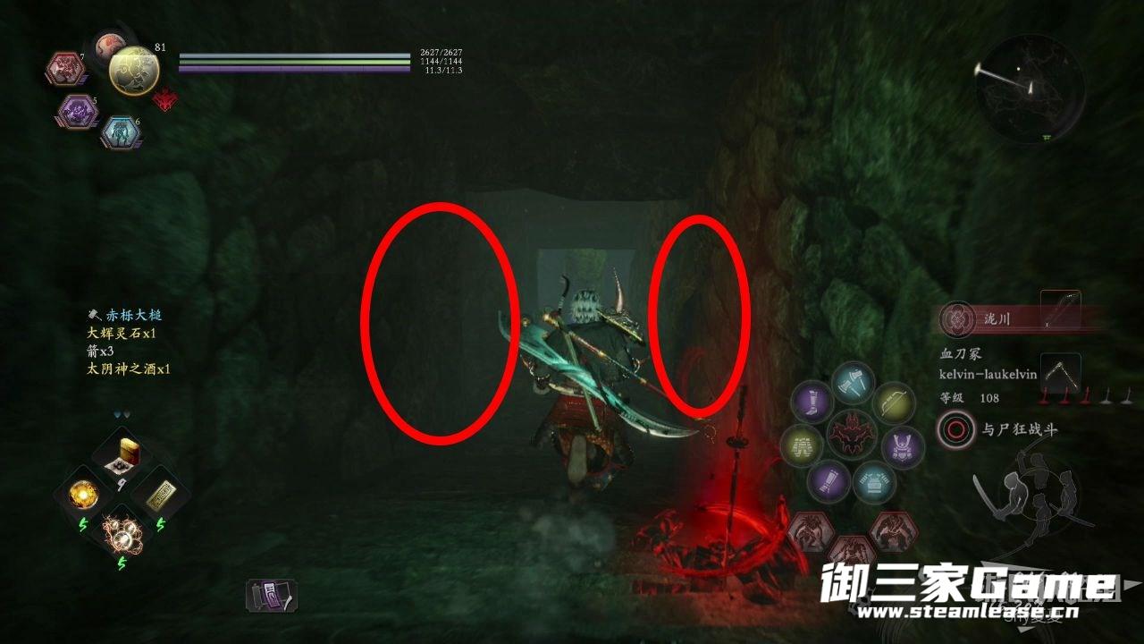 接下来从贴着右墙上山(左边的轮入道和外道兵不用理会),上山后在红圈处的建筑里打开门,可以放下一个梯子。